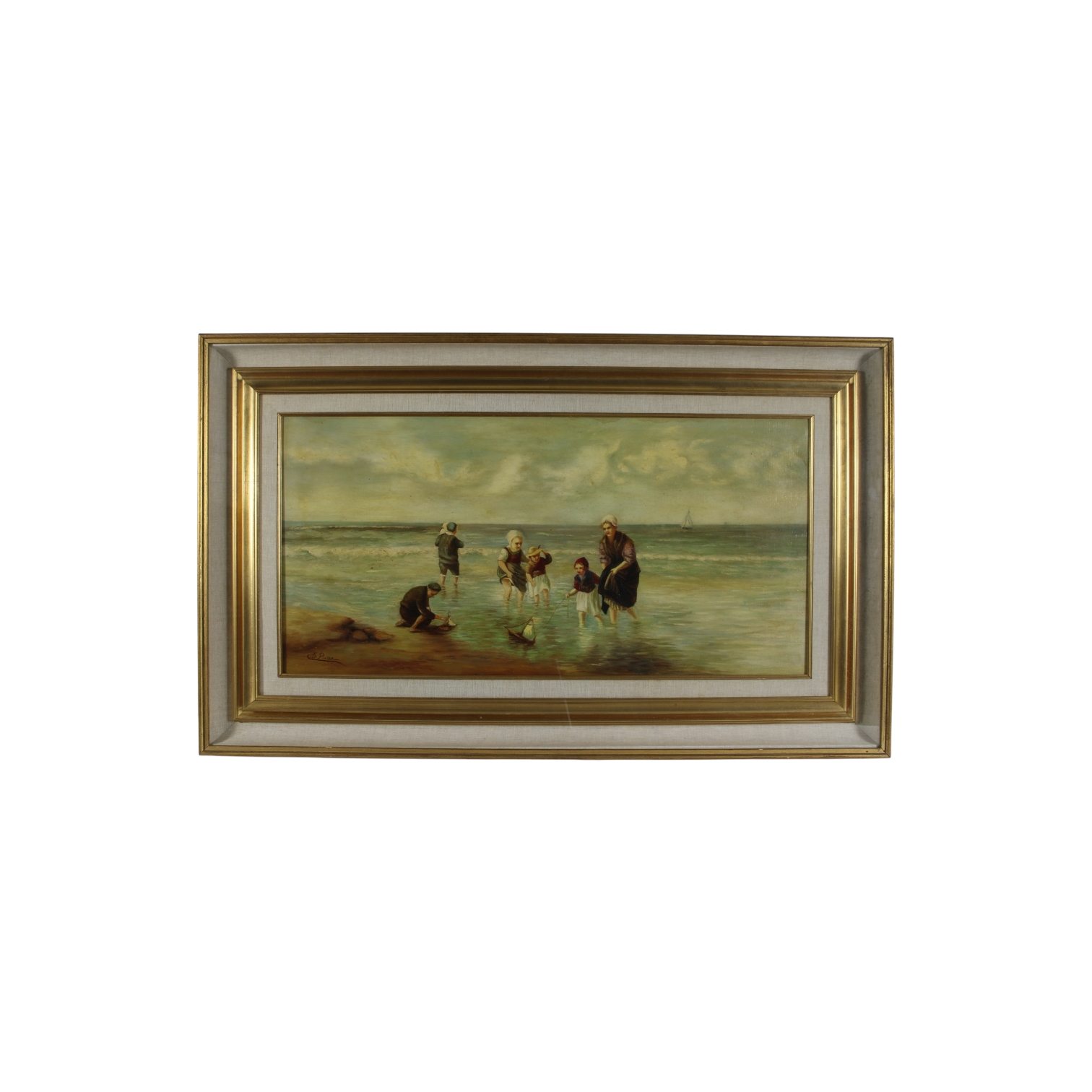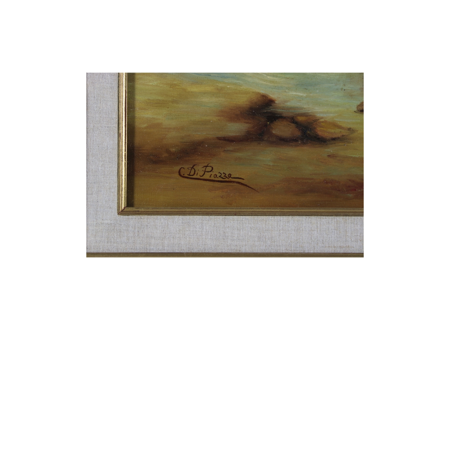 OLIO SU TELA raffigurante marina con personaggi al bagno a firma C. Di Piazzadentro cornice in legno dorato XX secolo h cm 44 x 86 / cornice h cm 70 x 114