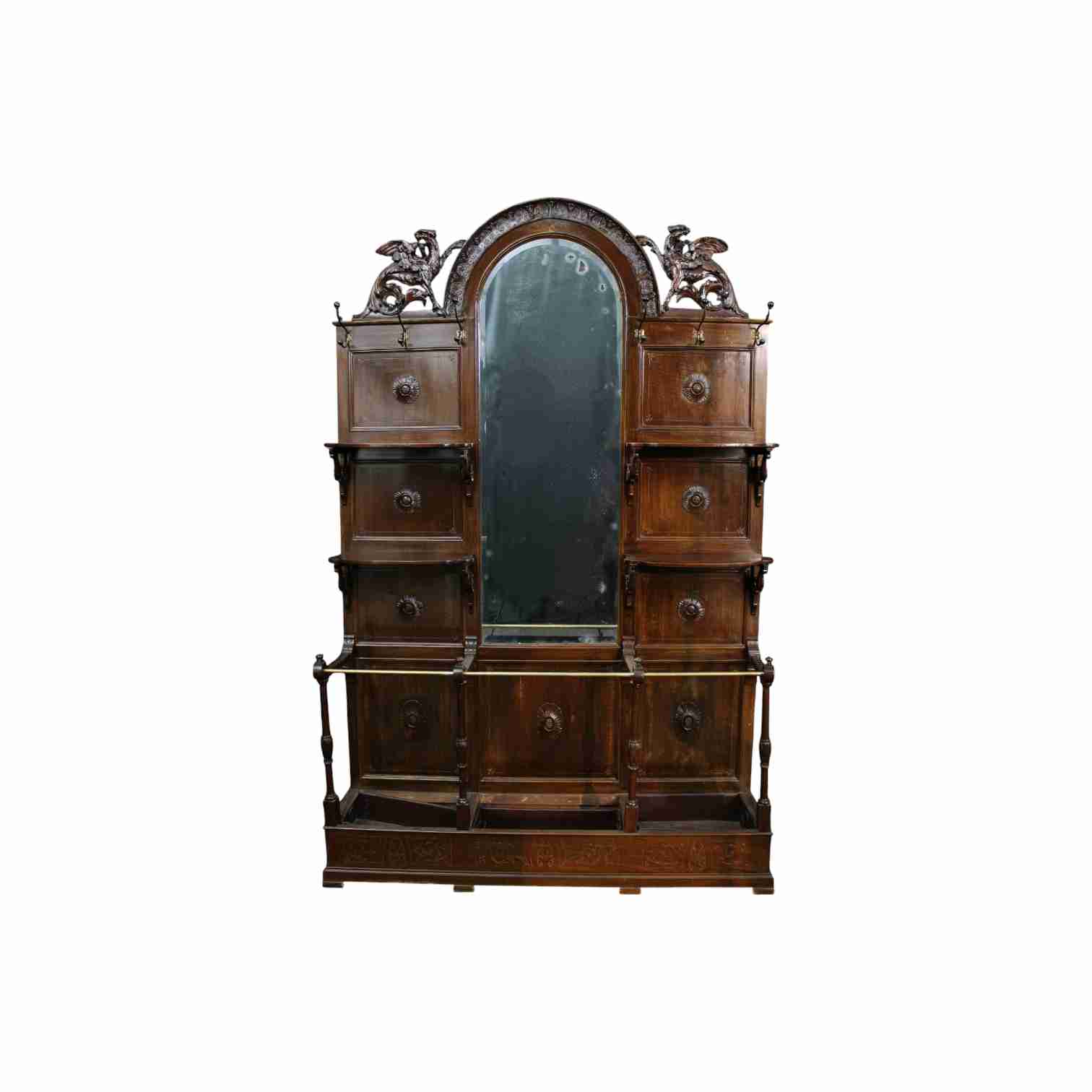 GRANDE CAPPELLIERA in legno di noce arricchita da intagli e specchio sul fronte Italia fine 800 primi 900 h cm 226 x 49 x 34
