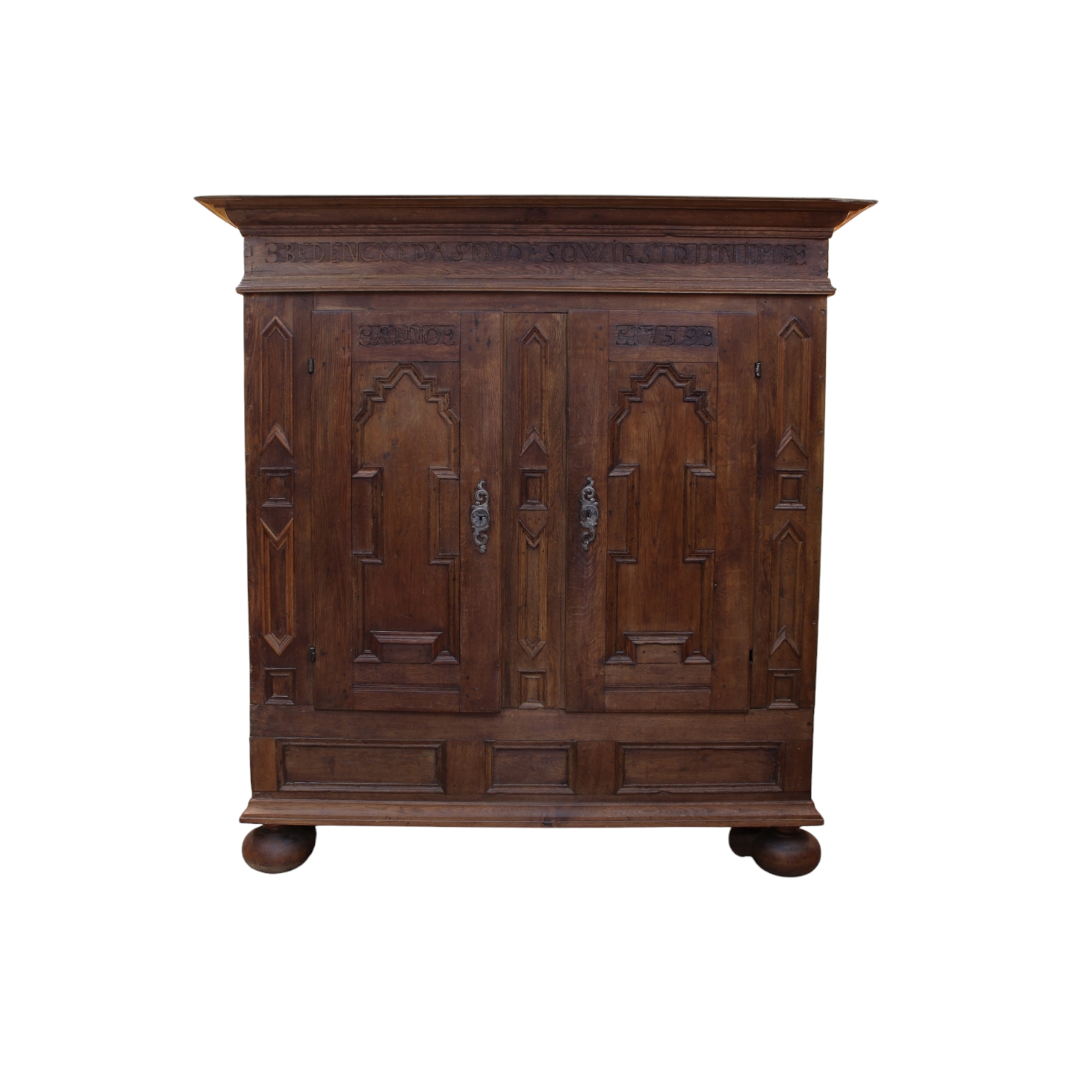 ARMADIO in legno di castagno scolpito a due ante con piedi a cipolla manifattura fiamminga XVIII-XIX secolo h cm 200 x 195 x 65