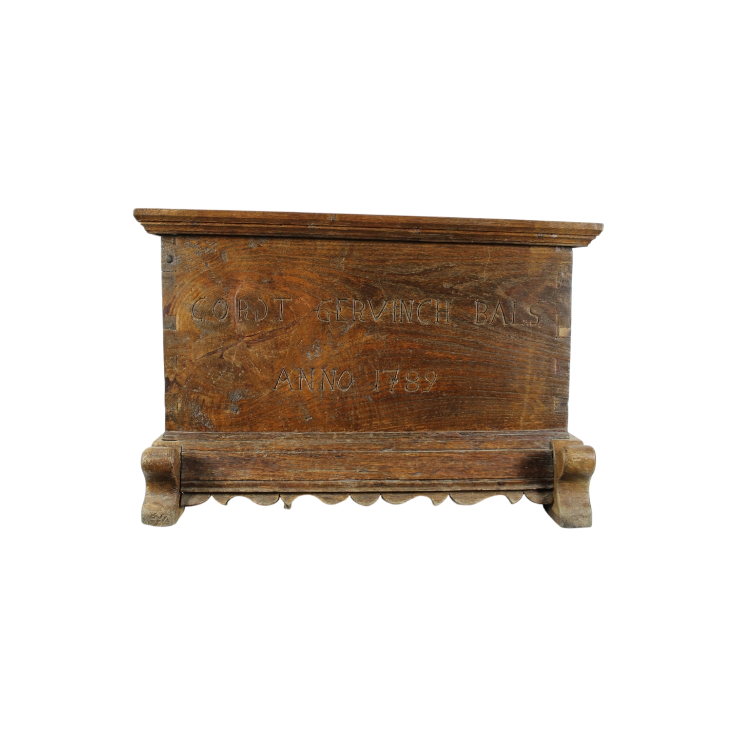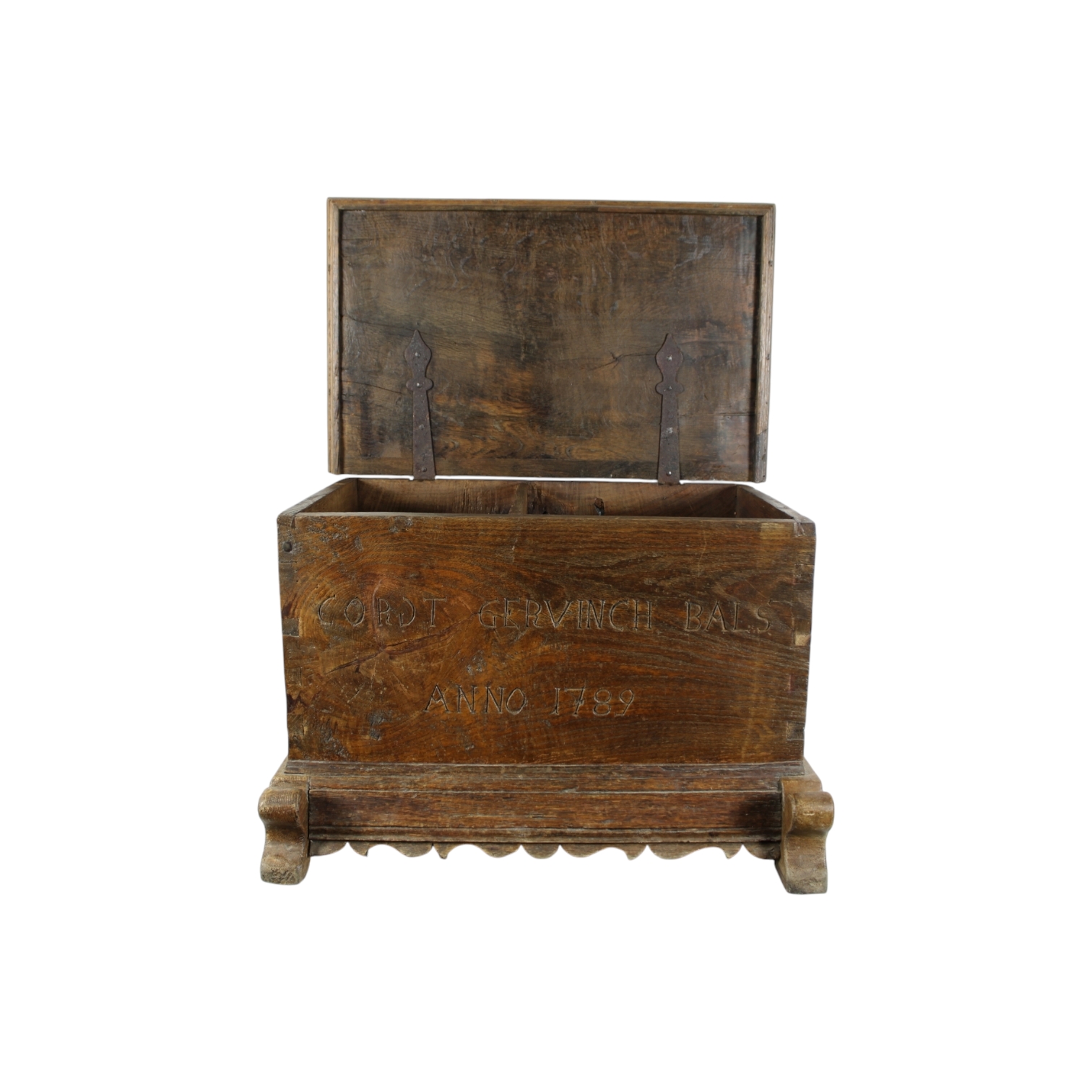PICCOLA CASSAPANCA DA VIAGGIO in castagno con scritta riportata sul fronte "CORGOT GERV INCH BALS anno 1789" Germania XVIII secolo h cm 46 x 73 x 50
