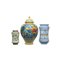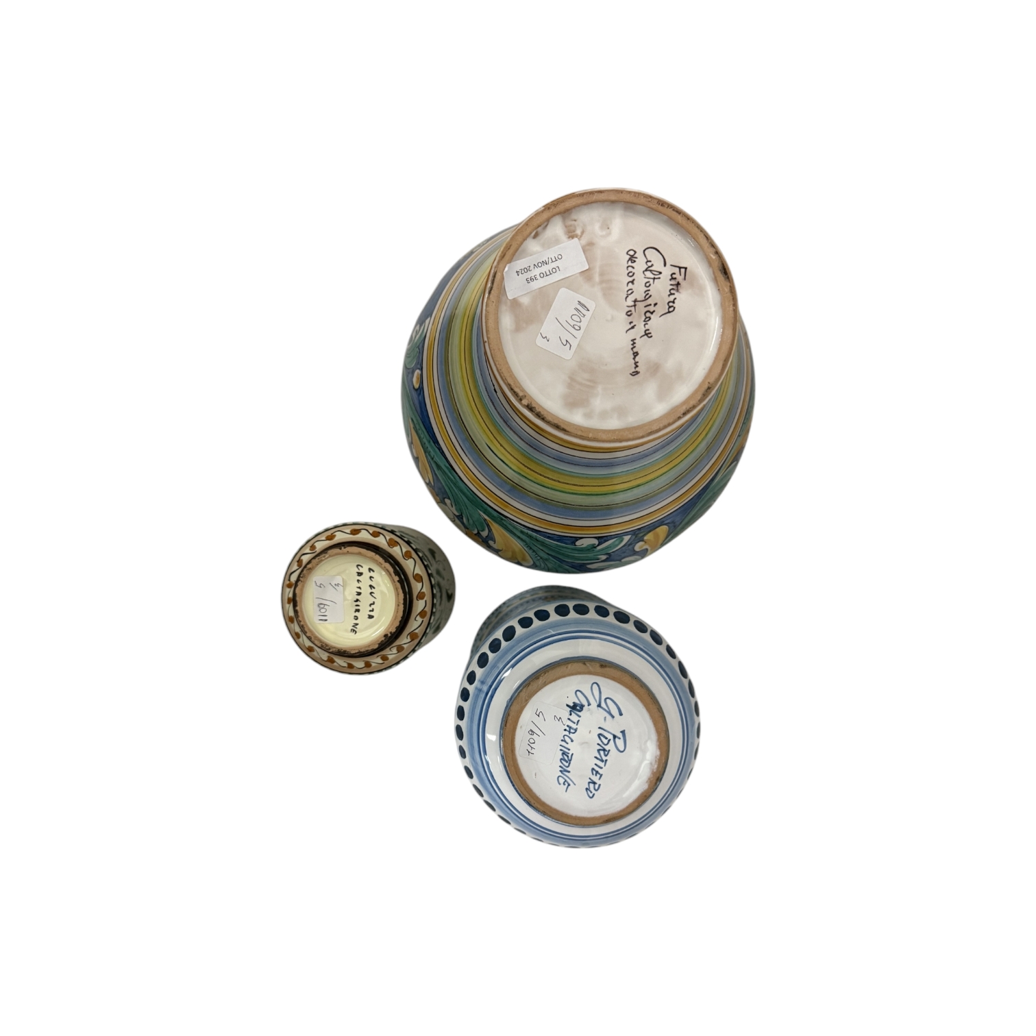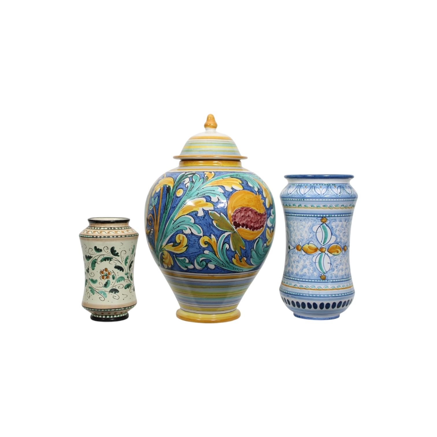 LOTTO COMPOSTO DA 3 maioliche di cui: 2 alberelli e 1 boccia con coperchio manifattura Caltagirone XX secolo h cm 35 / h cm 25 / h cm 18