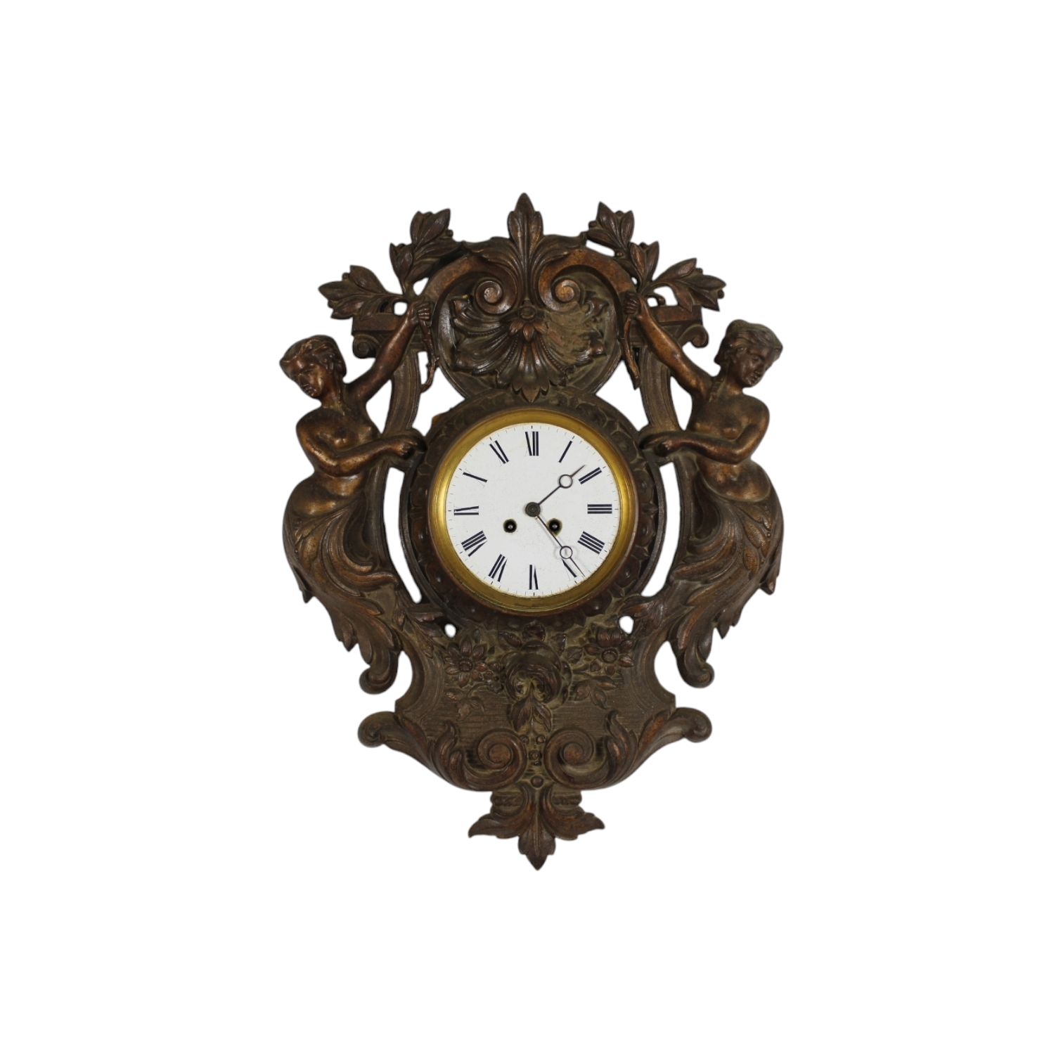 OROLOGIO DA PARETE in fusione di metallo finemente cesellato e brunito a forma di lira sorretto da figure femminili maestranze fiamminghe XIX-XX secolo h cm 60 x 46 x 5