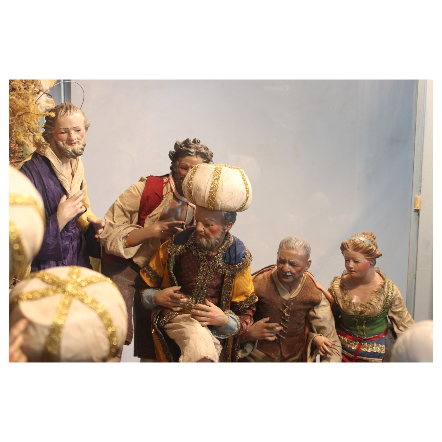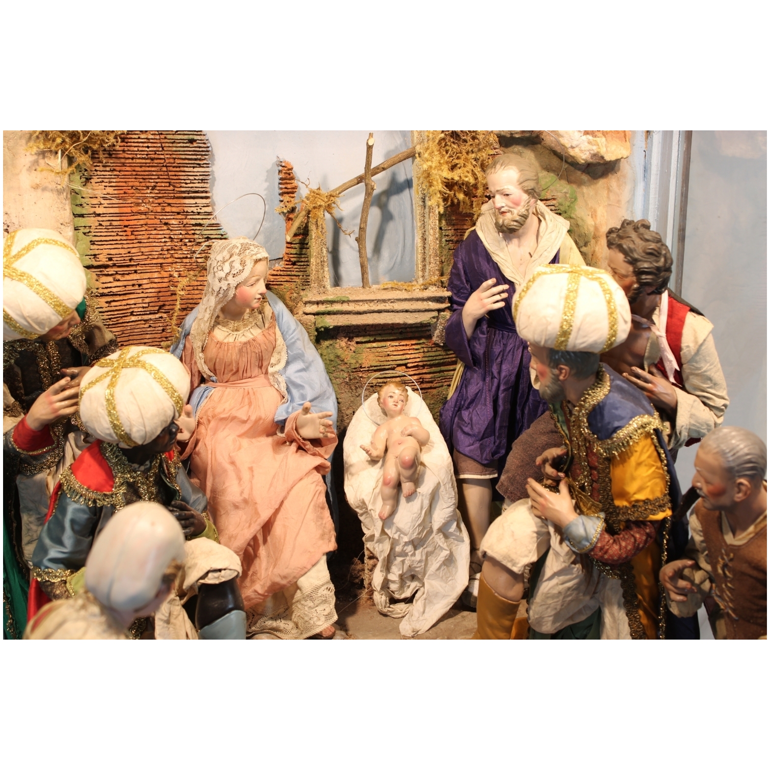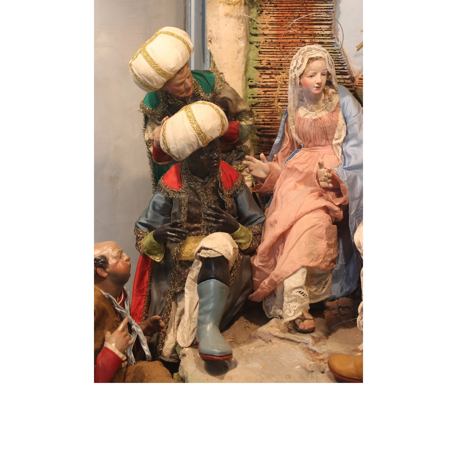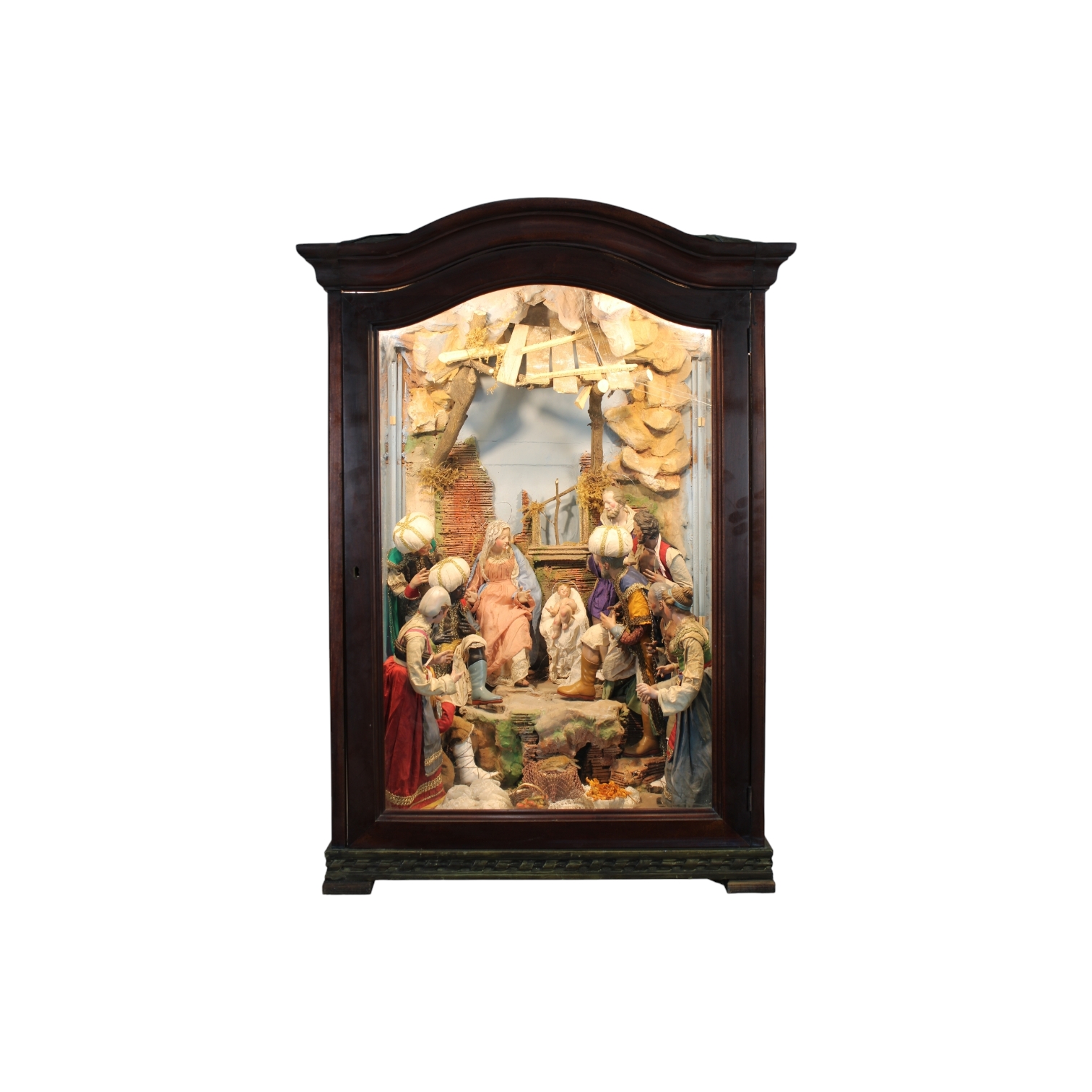 IMPORTANTE GRANDE TECA in legno di noce arredata da presepe con figure raffiguranti Natività e i Re Magi con arti in legno e testa in terracotta maestranze napoletane XIX secolo