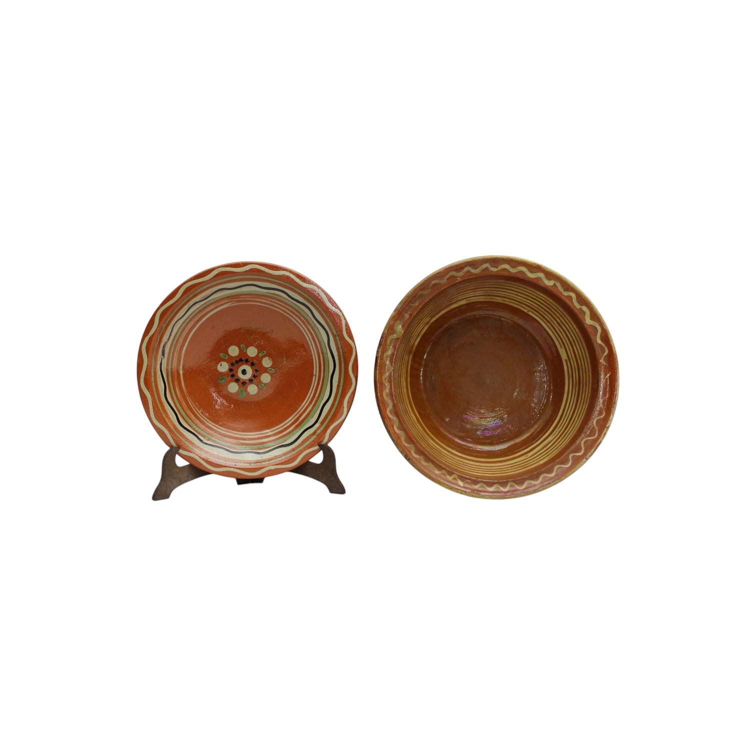 DUE PIATTI in terracotta smaltata popolare decorati da greche Europa del Nord XX secolo cm Ø 29 / cm Ø 32