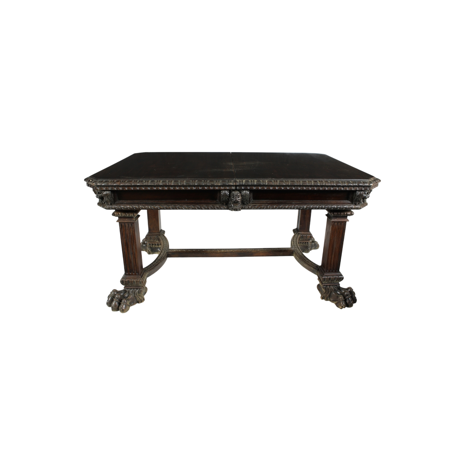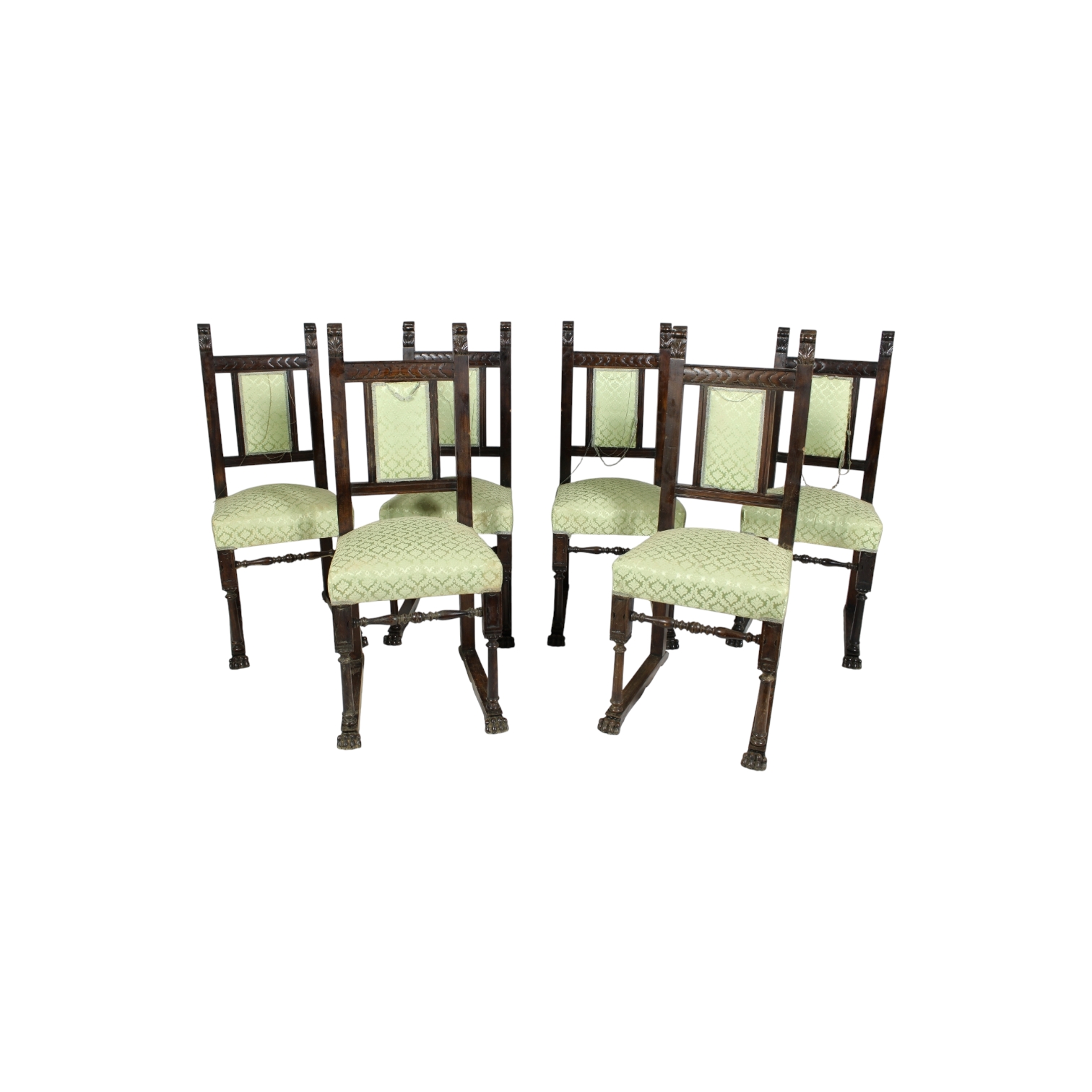 TAVOLO ALLUNGABILE E 6 SEDIE di gusto rinascimentale in legno riccamente scolpito Sicilia XIX secolo h cm 79 x 156 x 104 / h cm 110 x 46 x 43