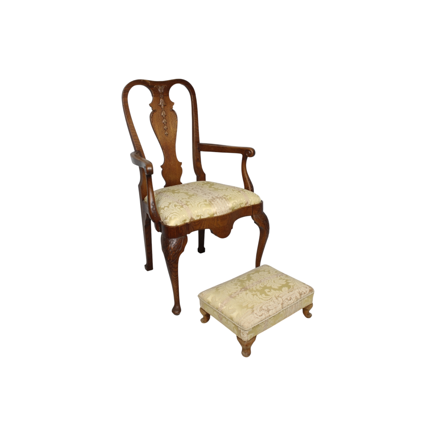 POLTRONA CON POGGIA PIEDI in legno do rovere di gusto vittoriano Inghilterra XIX secolo h cm 108 x 61 x 47 / h cm 15 x 43 x 33