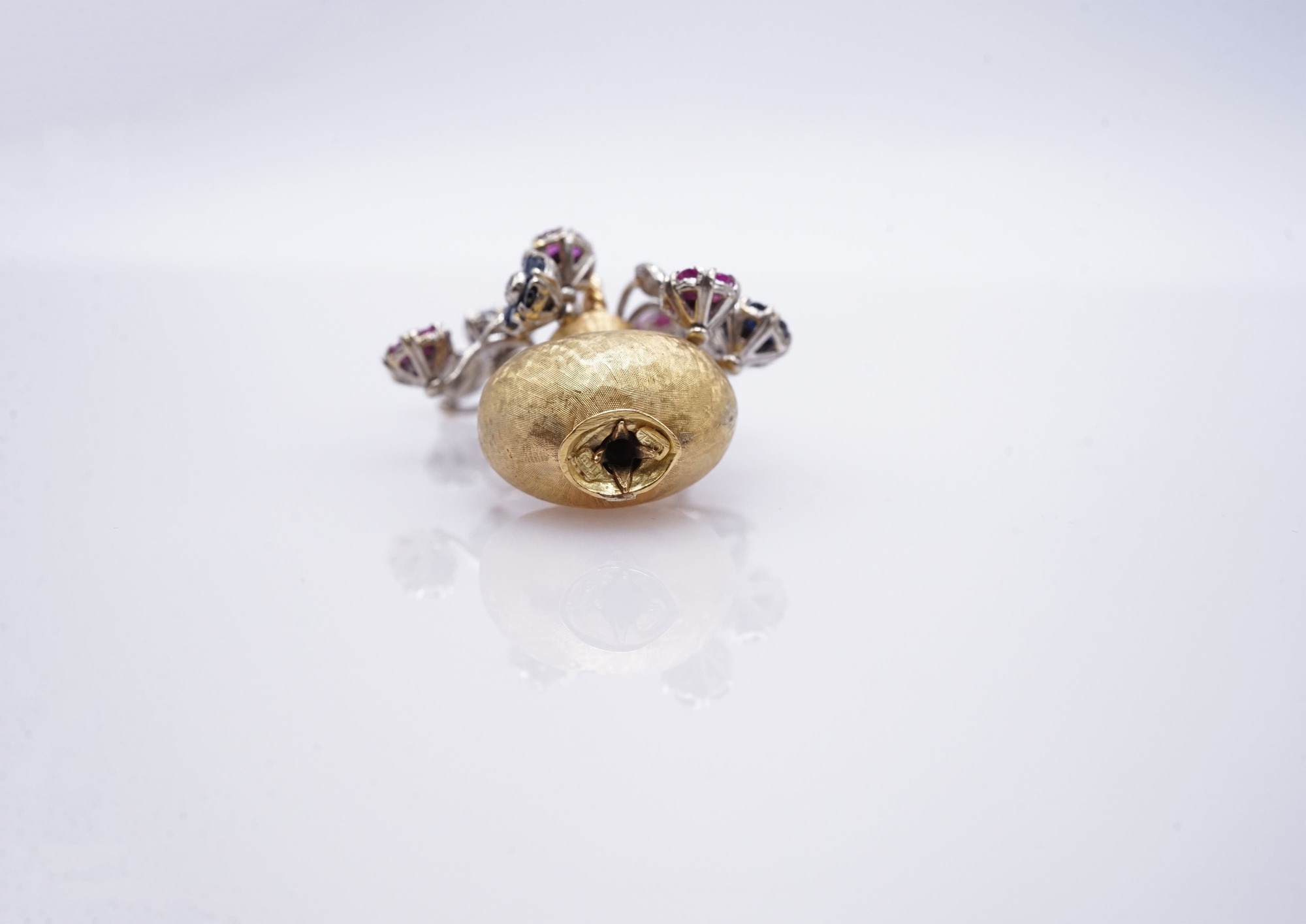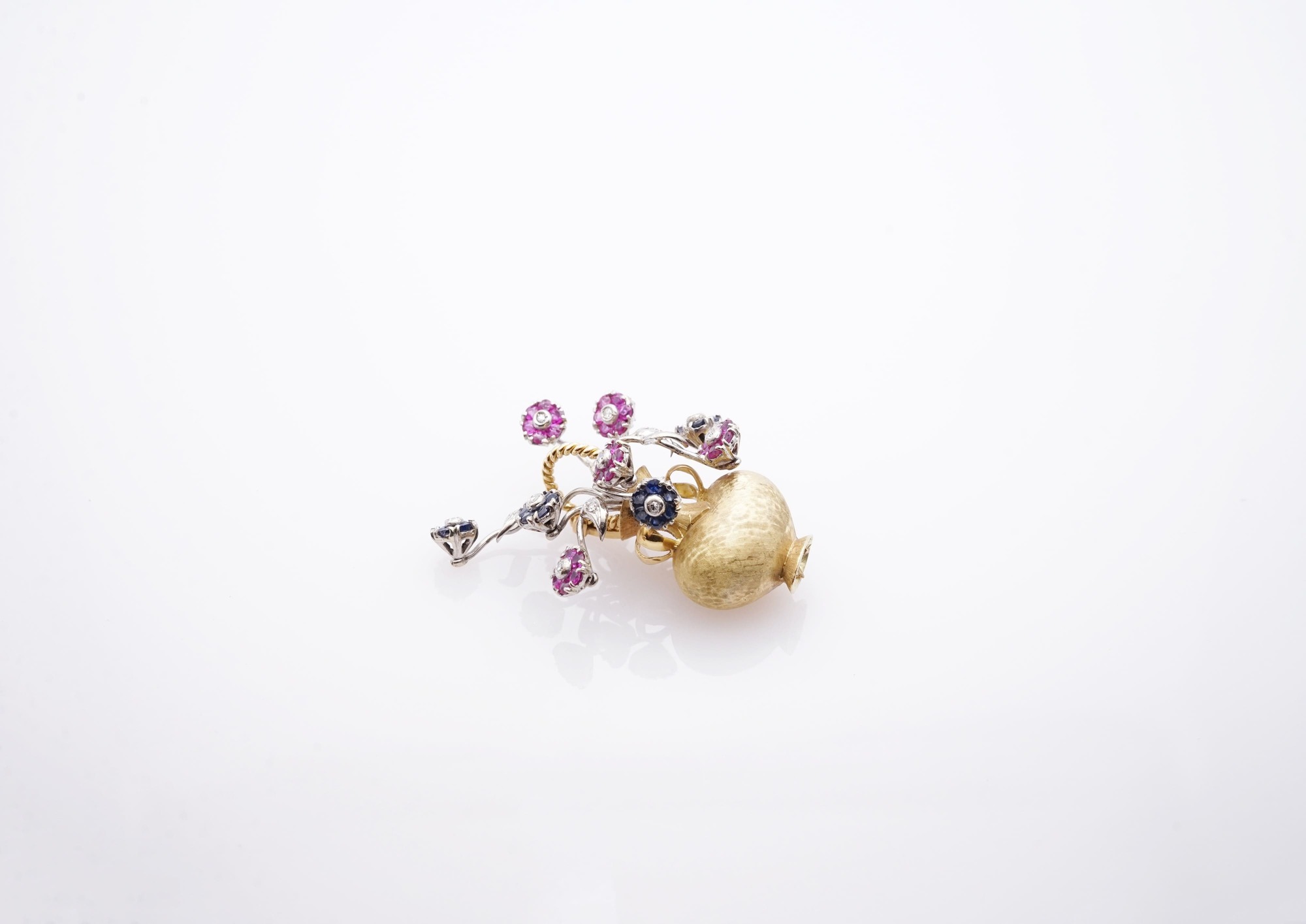 oro giallo ed oro bianco 18k, raffigurante un vaso con finitura satinata e fiori in zaffiri, rubini e diamanti. Diamanti taglio huit-huit per circa 0.28 ct, colore G - H, Purezza VS. Punzonato 750. Dimensioni 5.5 x 3.5 cm. Peso 19.6 gr.