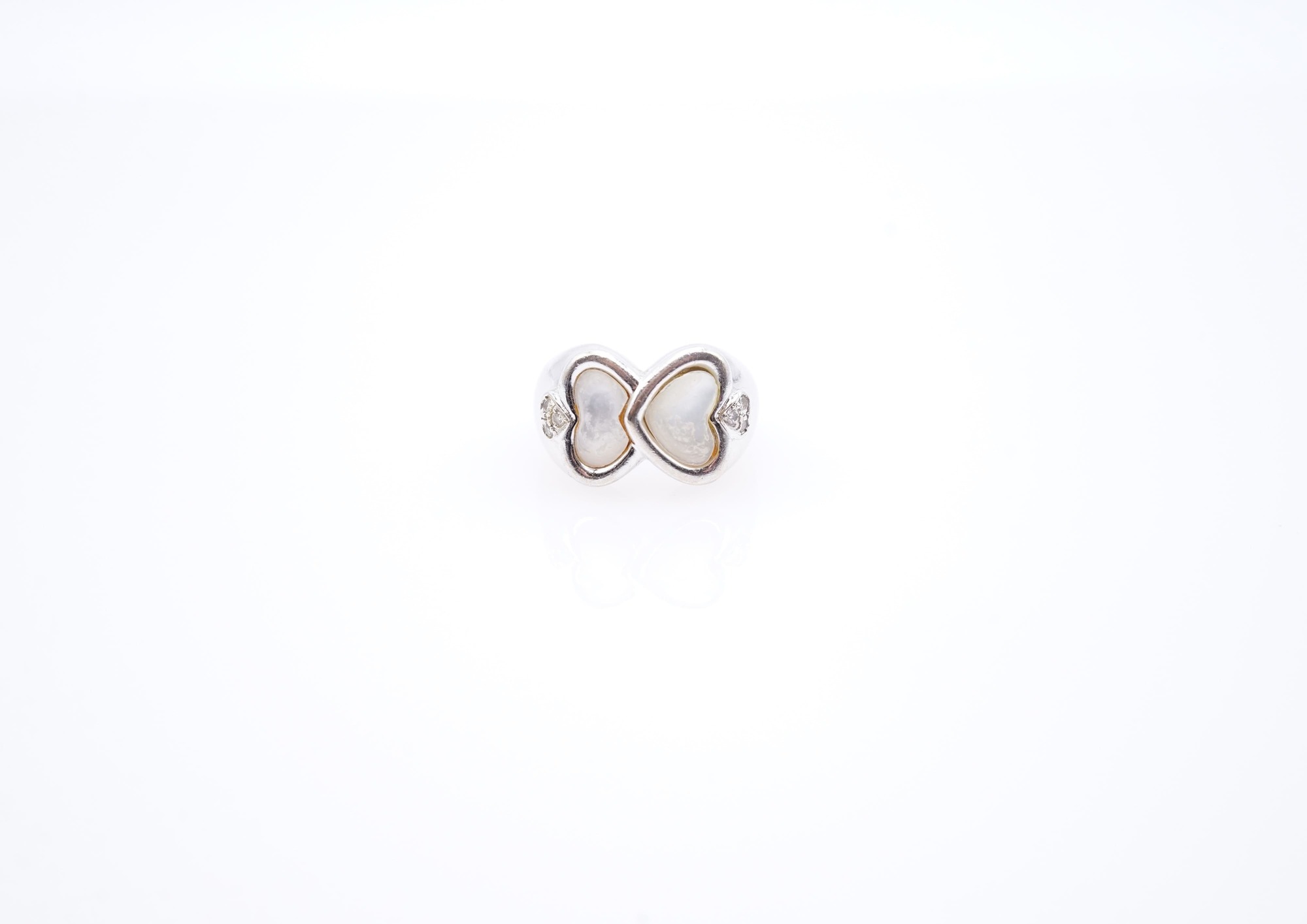 oro bianco 18k, con motivo di cuori in madreperla e pave' di diamanti rotondi, taglio brillante per circa 0.06 ct, colore G - H, purezza VS. Misura anello: 13. Peso: 10.7 gr.