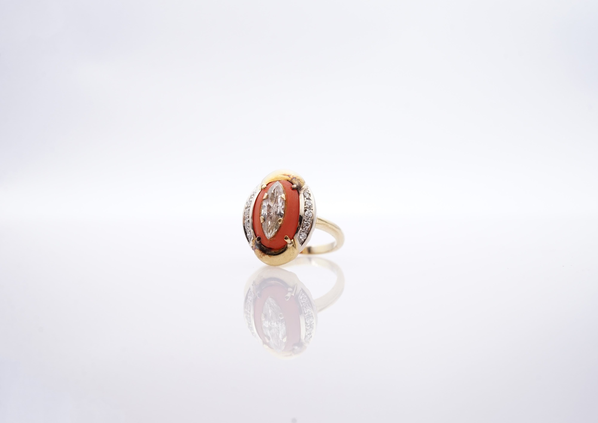 oro giallo ed oro bianco, con diamante di taglio a navetta incastonato su di un inserto in corallo cerasuolo (corallium elatius), dettagli laterali in piccoli brillanti. Il diamante centrale di forma a navetta, taglio brillante modificato, circa 0.65 ct, colore H - I, purezza P, affiancato da 10 diamanti rotondi taglio huit-huit per circa 0.30 ct, colore G - H, purezza VS - SI. Punzonato 750. Misura anello 10. Peso 7,7 gr.