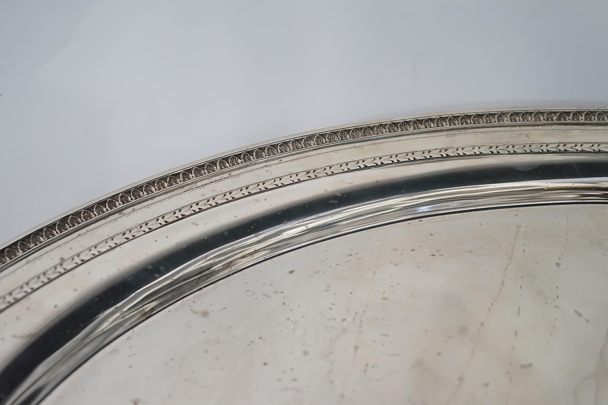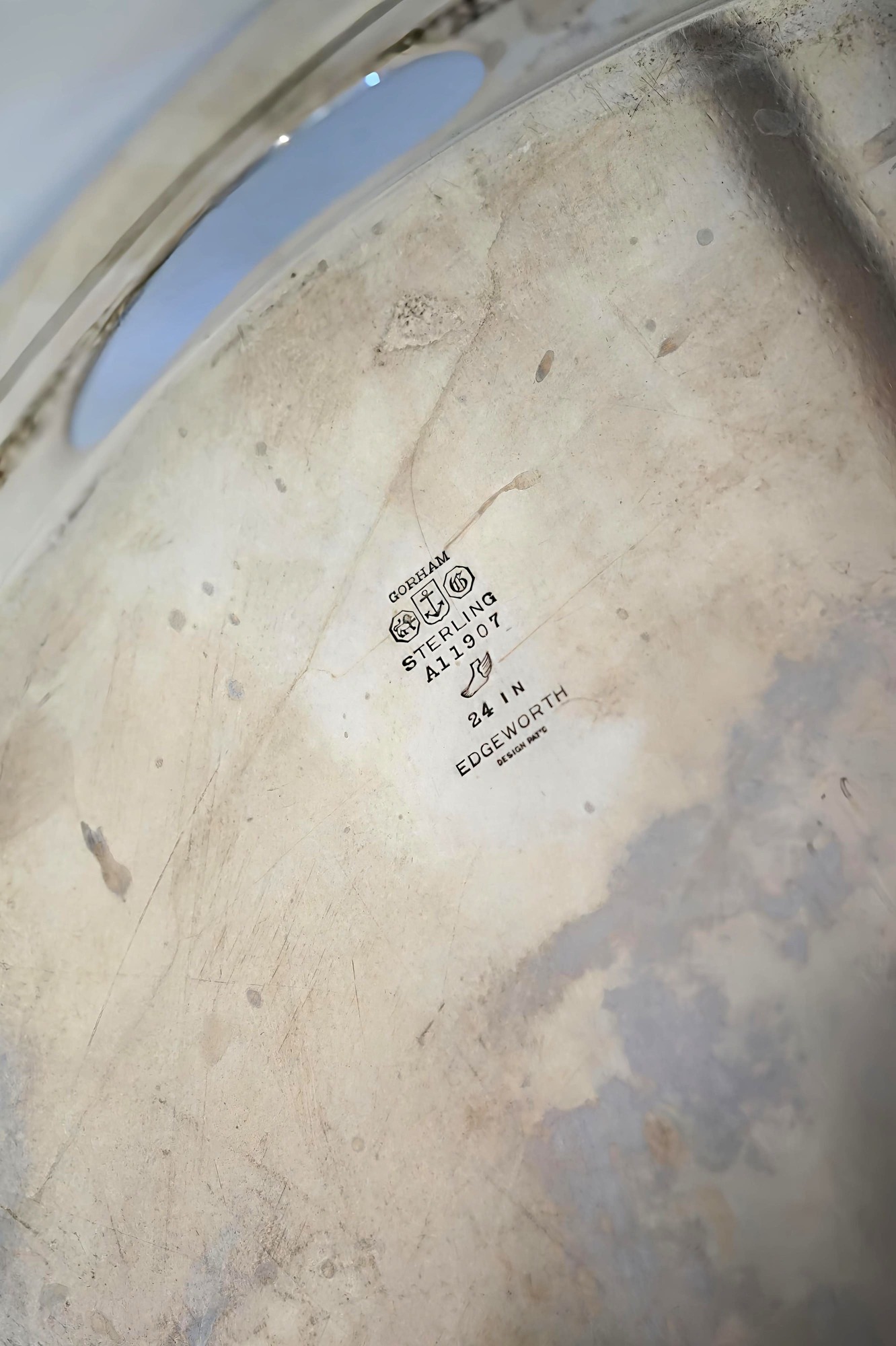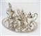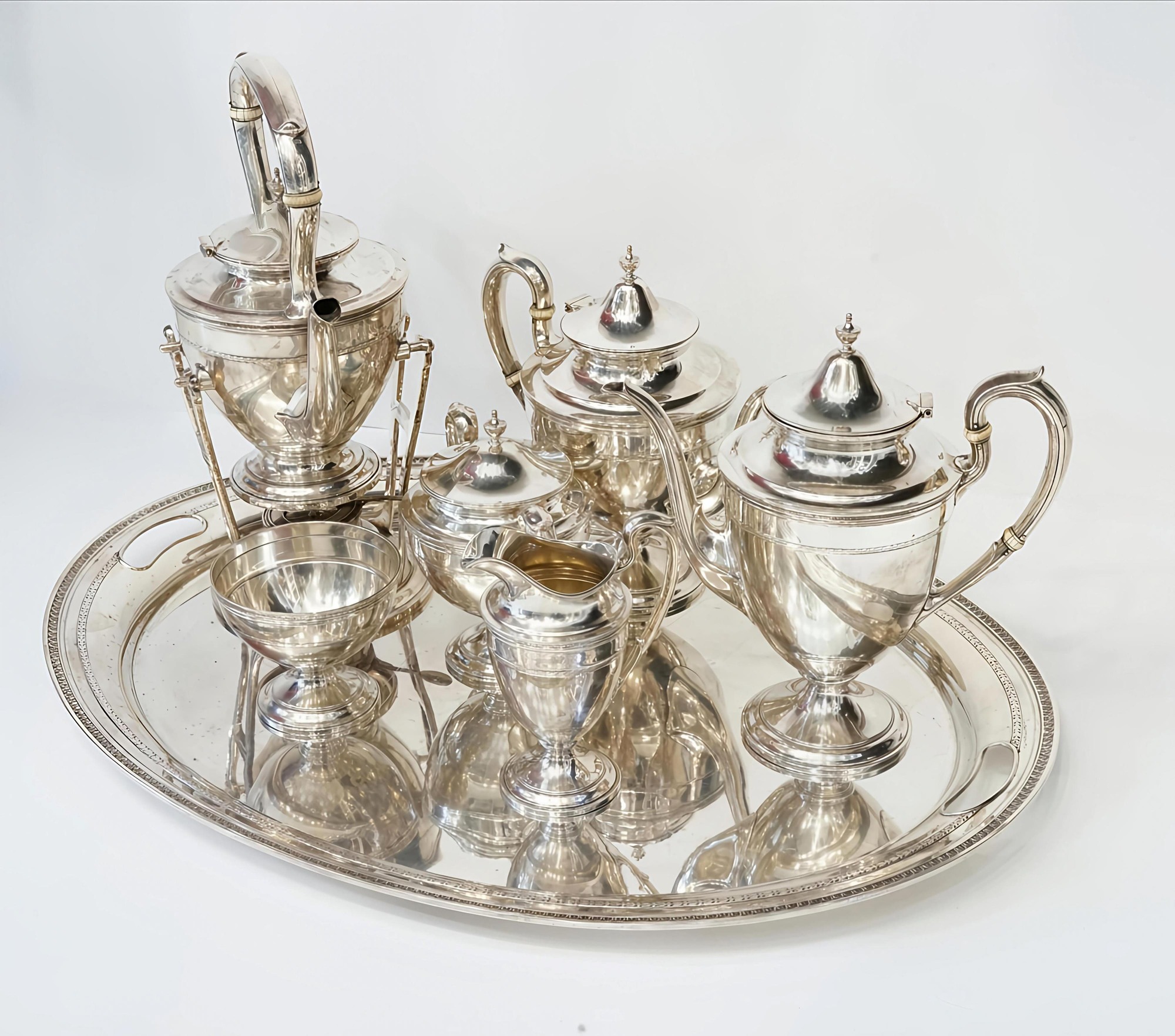 Composto da: un samovar, due teiere, due zuccheriere, un bricco per il latte ed un vassoio. Punzonato sotto la base GORHAM, STERLING, A11907, 24 IN, EDGEWORTH. Serie completa di marchi. Dimensioni del vassoio 64 x 47 cm. Altezza del samovar 35 cm. Peso totale 7285 gr. Difetti, ammaccature.
