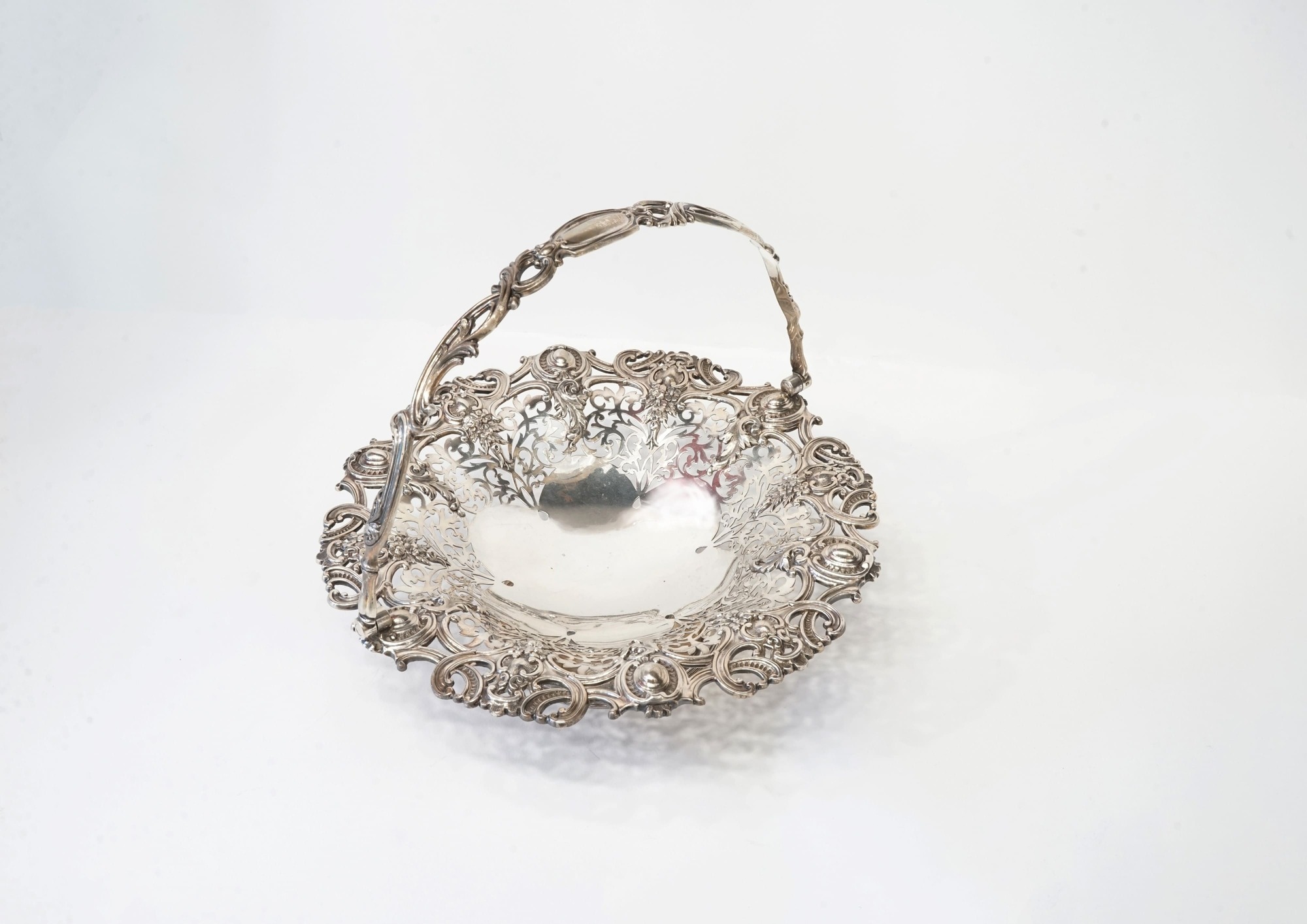 Cestino vittoriano in argento 925‰, di forma rotonda con manico, traforato e decorato con volute vegetali fiorate alternate a volute fogliate stilizzate. Inghilterra, serie completa di marchi. Diametro 31 cm. Peso 860 gr.