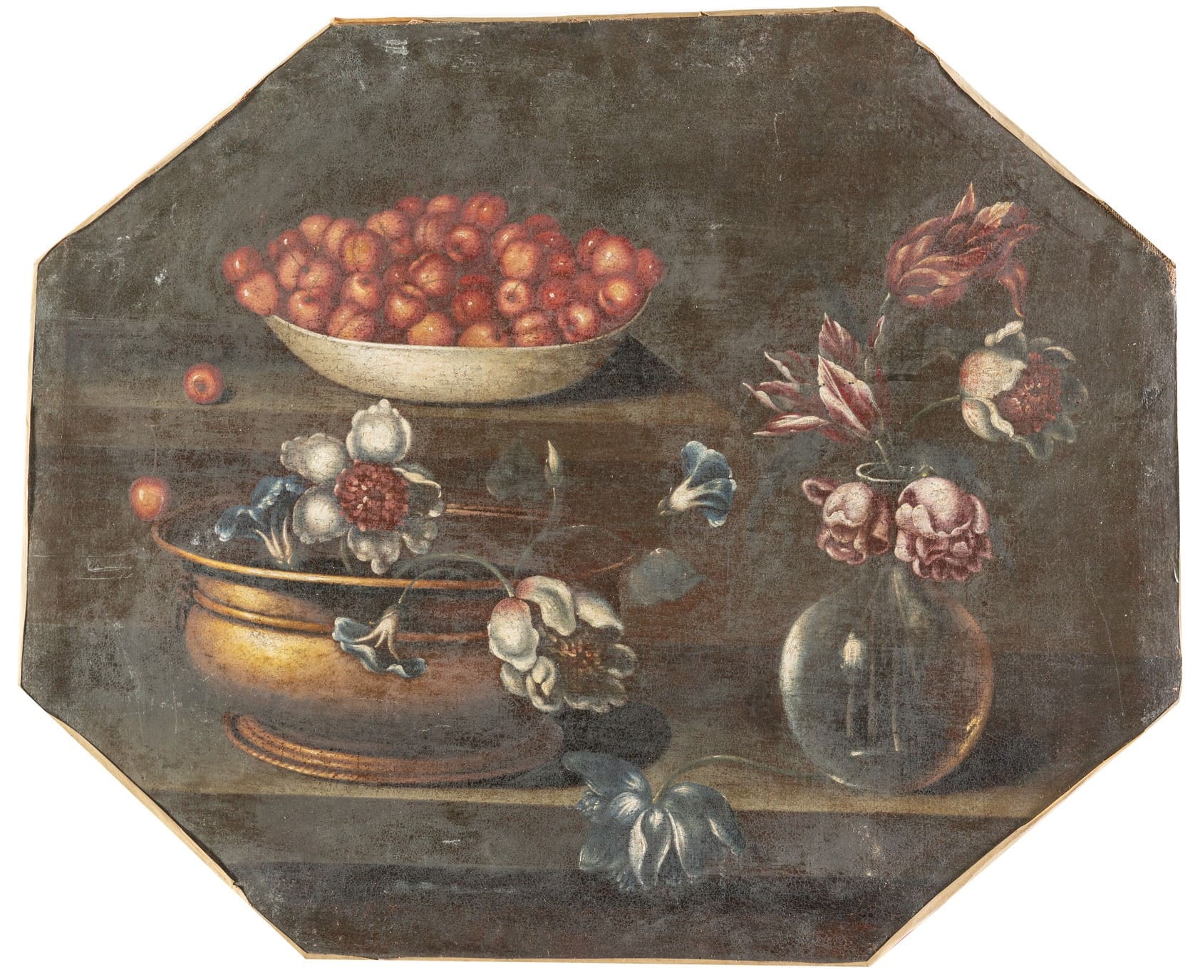 Pittore del XVII-XVIII secolo. Natura morta con ciliegie e vaso di fiori.