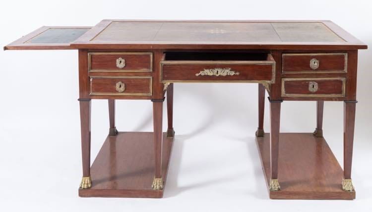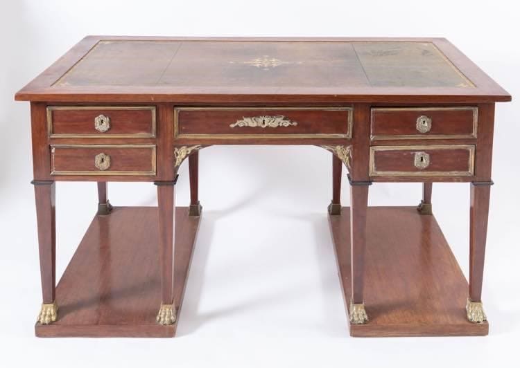 Scrivania da centro lastronata in mogano con piano in cuoio e bordo dorato con motivo di sfingi.Cm. 80x136,5x66,5.Reca in fascia cinque cassetti sostegni a tronco di piramide poggianti su basi terminanti con piedi ferini in bronzo dorato.