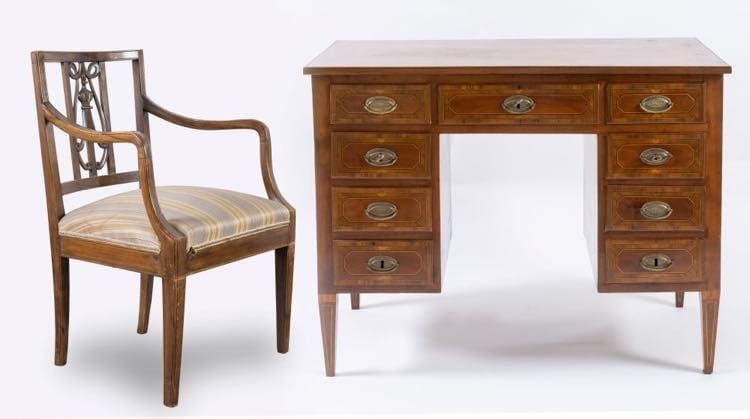 Scrivania da centro con poltrona. Fine XIX secolo.