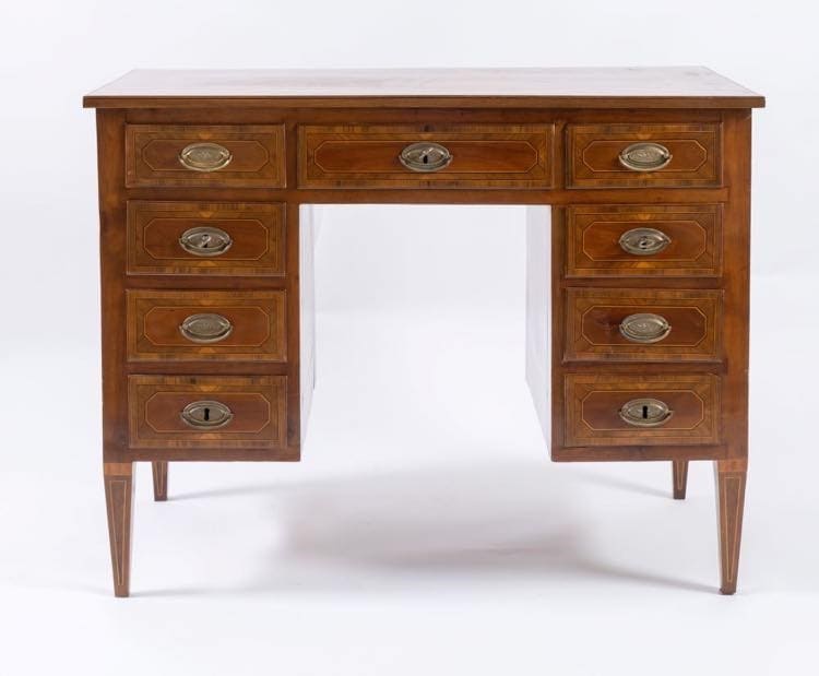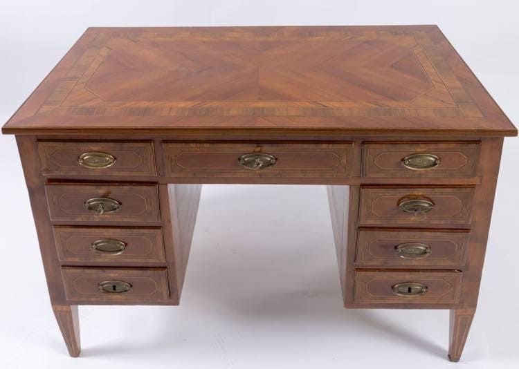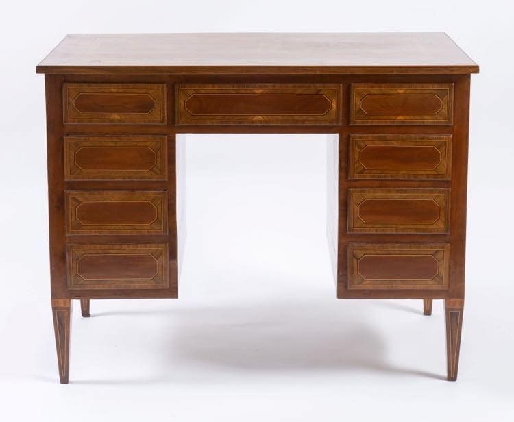 Cm. 83,5x108,7x62.Scrittoio lastronato in noce con motivi di filetto d'acero e riserve in ciliegio a nove cassetti, gambe troncopiramidali. Poltrona con dorsale centrata da elemento lira stilizzata con un globo, seduta imbottita.