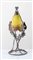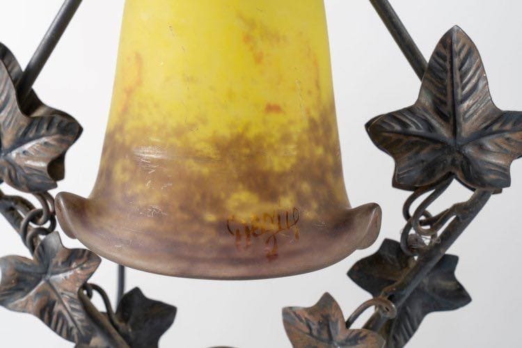Cm. 40, diametro complessivo cm. 16.Base in ferro battuto e motivi a tralci di edera. Paralume in pasta di vetro a forma di calice di fiore rovesciato, nelle gradazioni del giallo e del colore castagna.Firma Degué su paralume.