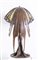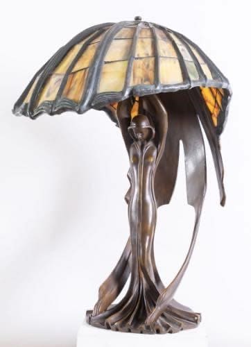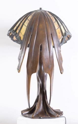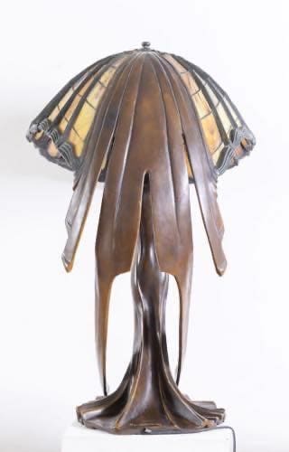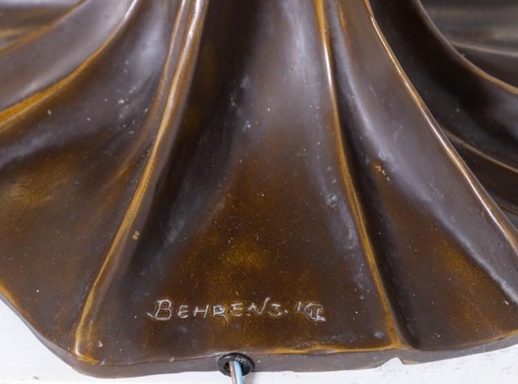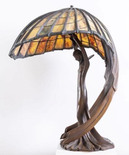 Altezza cm. 80. Diametro cm. 78.Lampada da tavolo con paralume in tessere di vetro nei toni del giallo, verde e arancio legate a piombo a disegni geometrici. Base in bronzo a patina scura a guisa di fanciulla che sorregge il paralume, come Atlante sorregge il globo. Da un disegno del 1902 di Peter Beherens. Firmata Behrens KT sulla base. Peso circa 30 kg. Realizzata negli anni '80. Produzione Tiffany Art Glass s.a.s. - di Reggianini & Co. Carpi, Modena. Modello LB 65 LB 65 S. Note L'unico esemplare originale fu disegnato da Peter Behrens per gli interni dell'edificio residenza della Colonia degli artisti di Darmstadt, dove un gruppo di artisti dello Jugendstill vissero e produssero le loro opere. Attualmente conservata presso Hessian House Wissenschaftsstadt, Darmstadt.