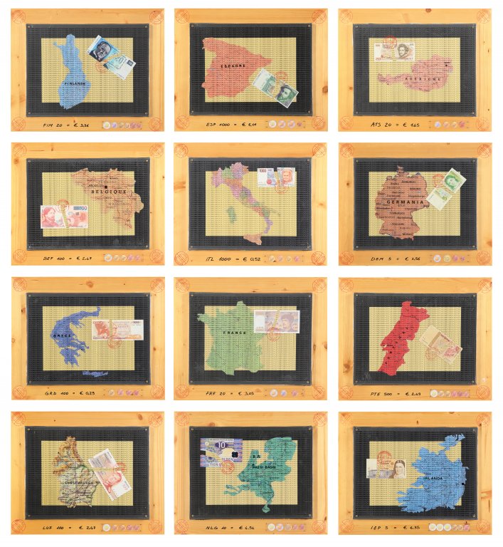 MIMMO ROTELLA (1918 - 2006) Fuori corso 1-1-2002 12 pezzi legno, tela, carta e plexiglass cm 40,7x50,7 (cadauno) esemplare 8/8 autentiche dell'artista su foto esposizioni: Samarcanda, mostra collaterale, gennaio-febbraio 2002, Centro Fiera del Garda, Montichiari (BS) Fuori corso 1-1-2002 12 pieces wood, canvas and plexiglass 16,04x19,98 in (each one) edition 8/8 photo certificates by the artist exhibitions: Samarcanda, collateral exhibition, january-february 2002, Centro Fiera del Garda, Montichiari (BS)
