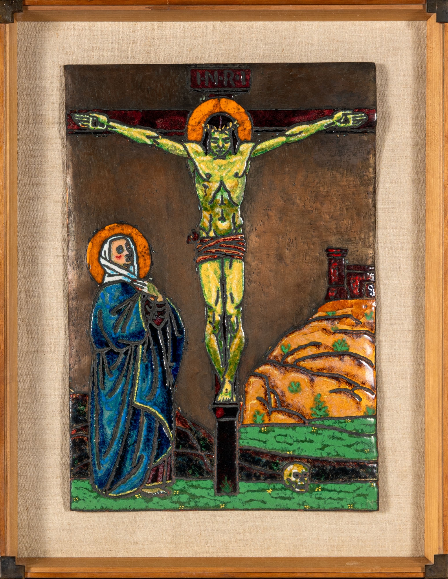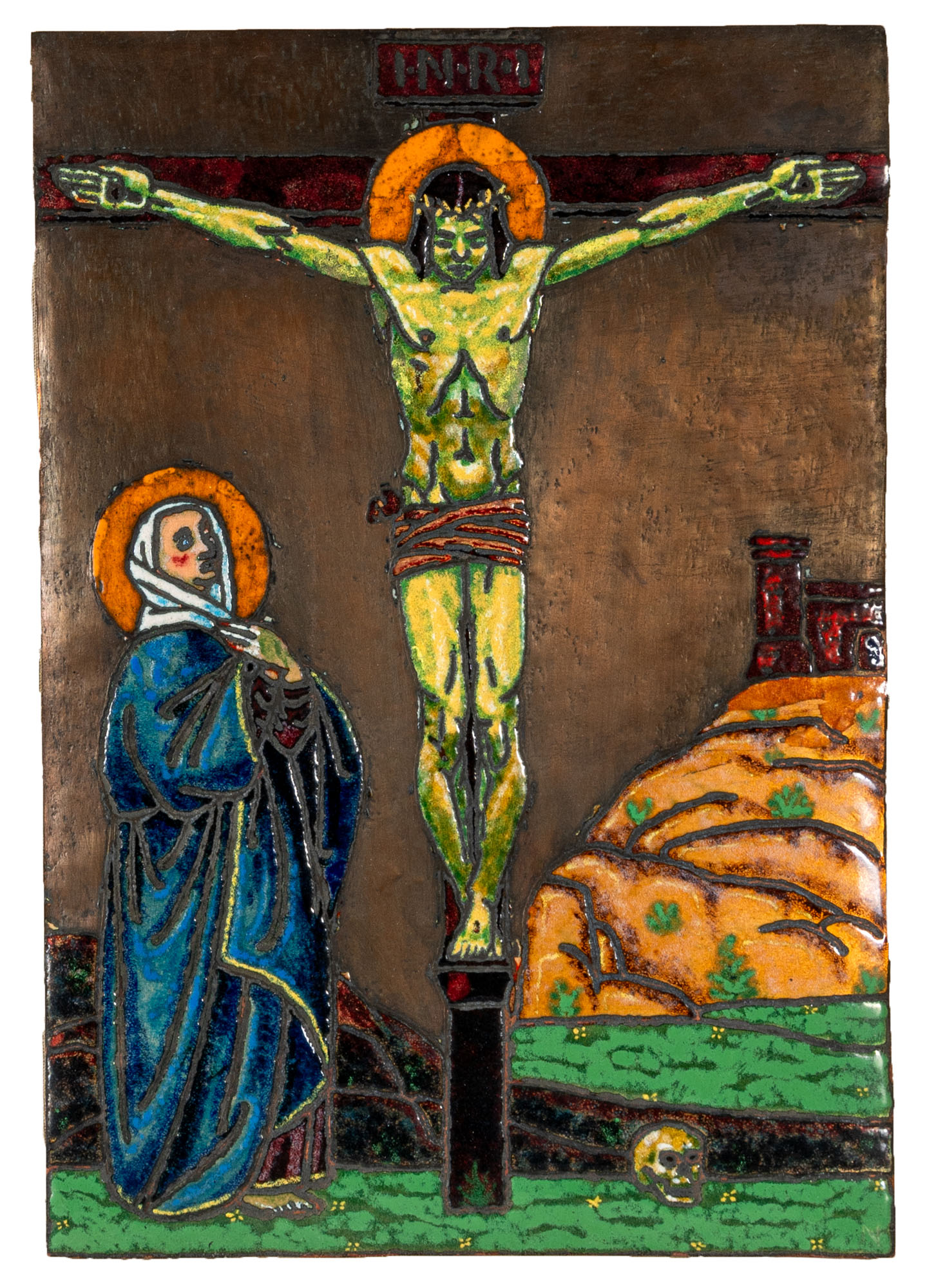Claudio Nani (secolo XX) - CrocifissionePiastra in metallo smaltato a policromia47 x 33 cmFirma al retroPROVENIENZA:Collezione privata, Bergamo
