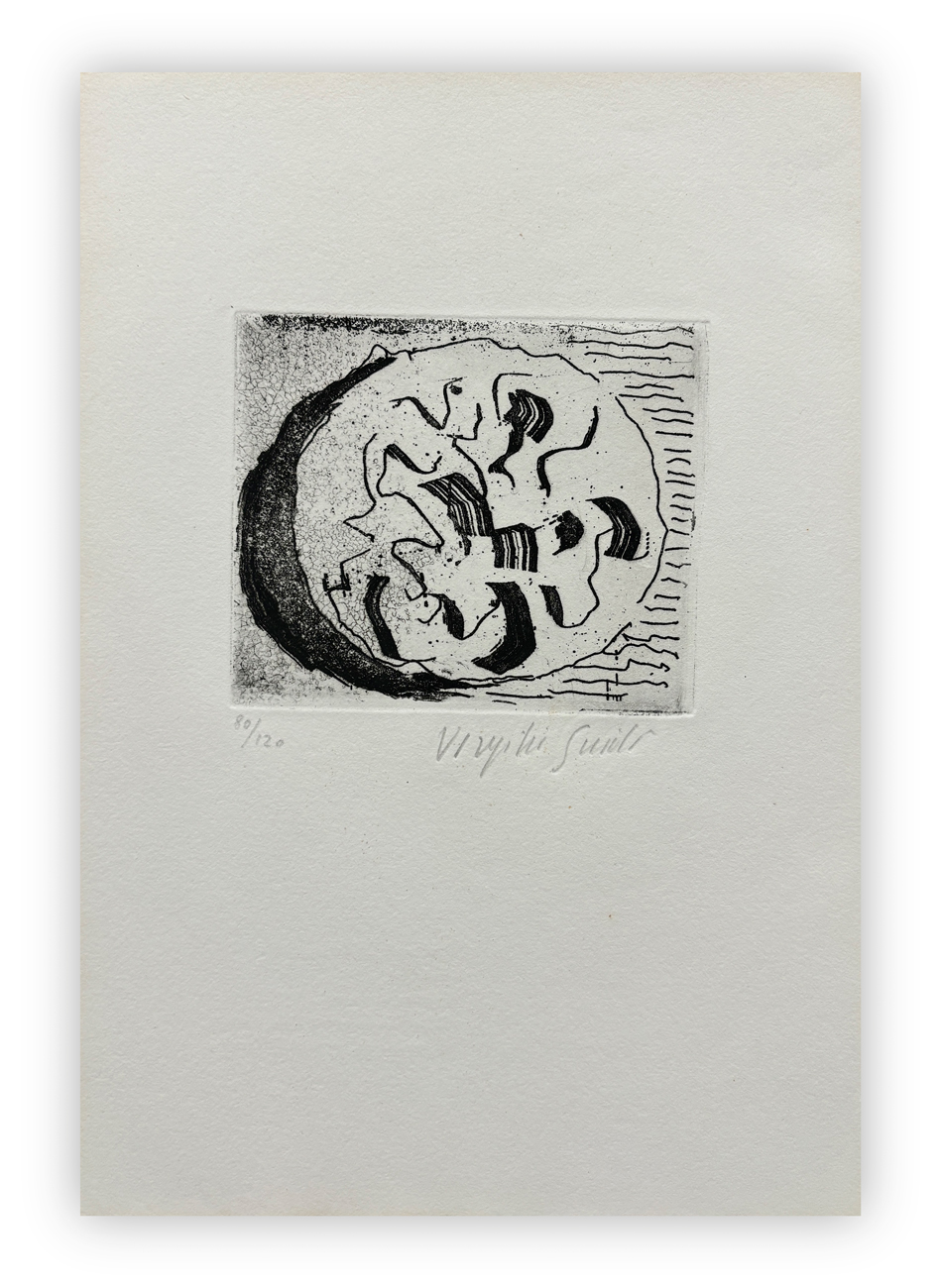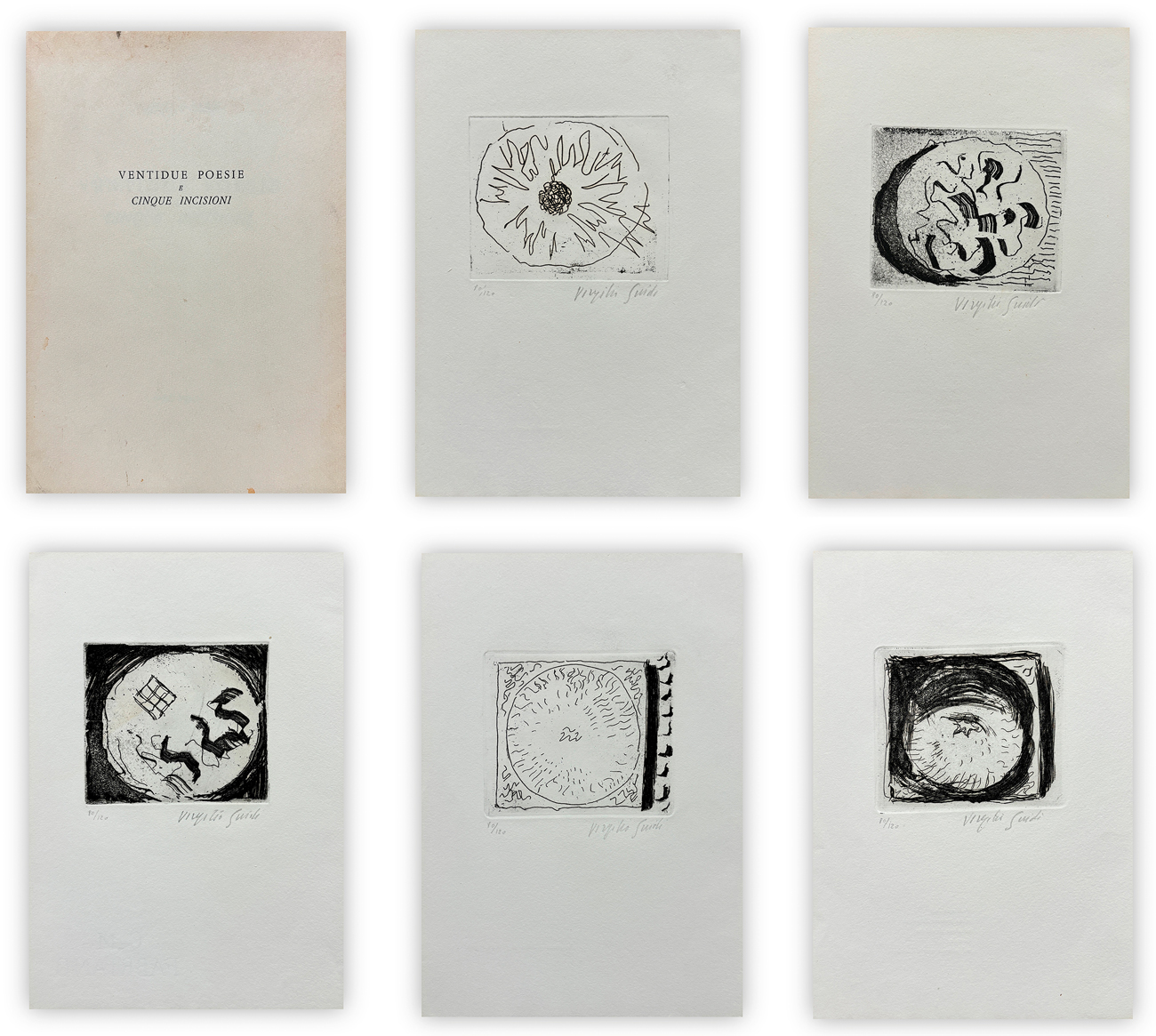 Edizione d'arte contenente ventidue poesie e 5 acqueforti di Virgilio Guidi firmate e numerate (Esemplare 80/120) a matita al fronte di ciascuna