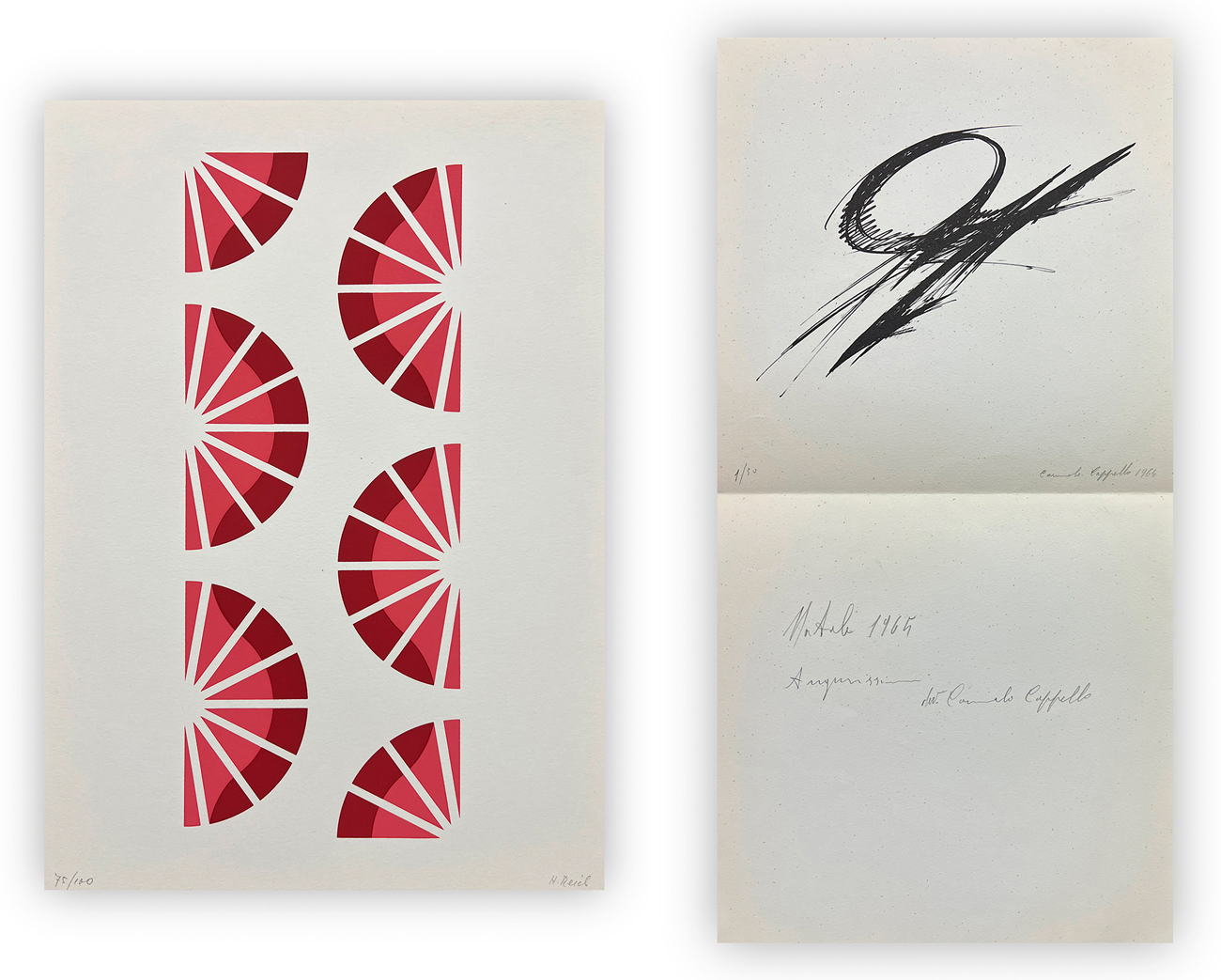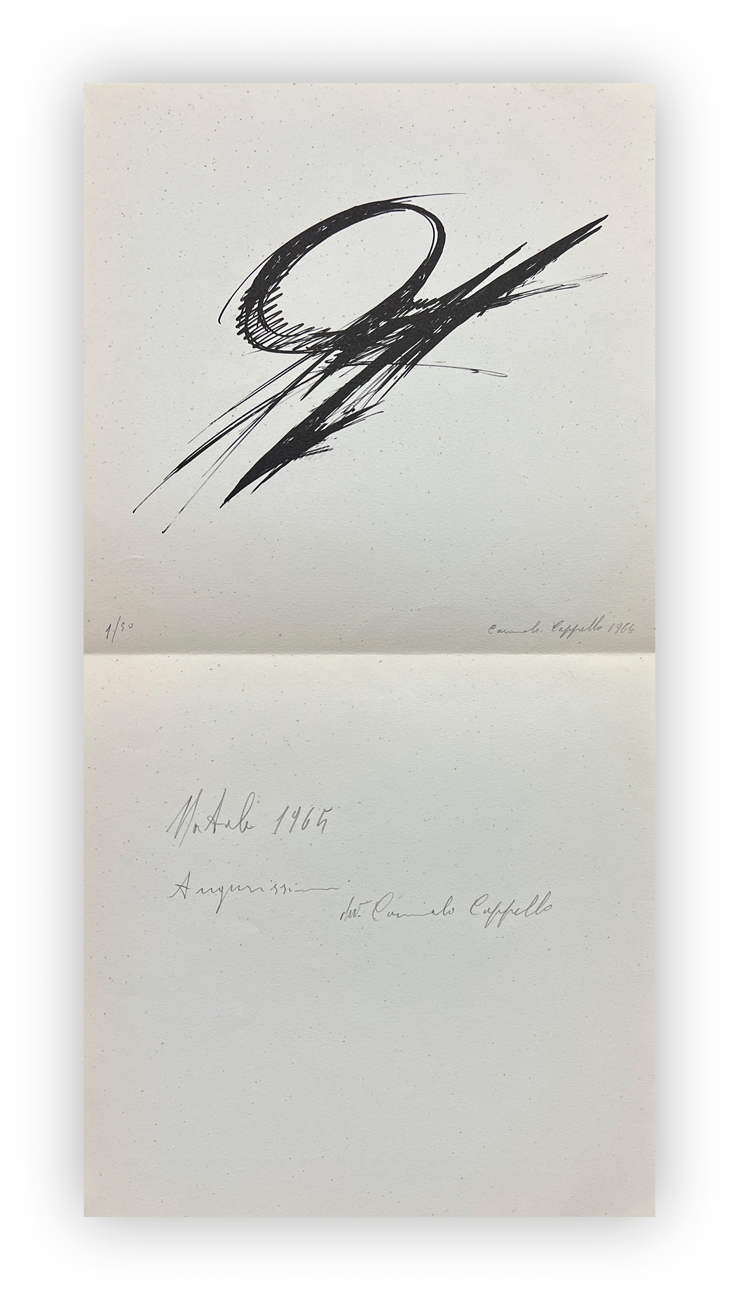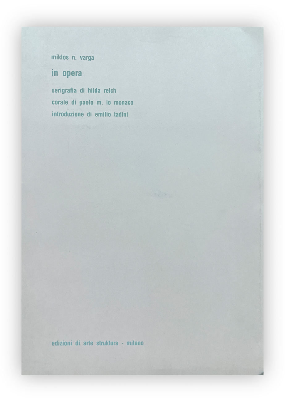 Entro cartella originale recante testo poetico di Miklos N. Varga e corale per pianoforte di Paolo N. Lo Monaco (entrambi recanti firme degli artisti e numerazione al fronte) e introduzione di Emilio Tadini