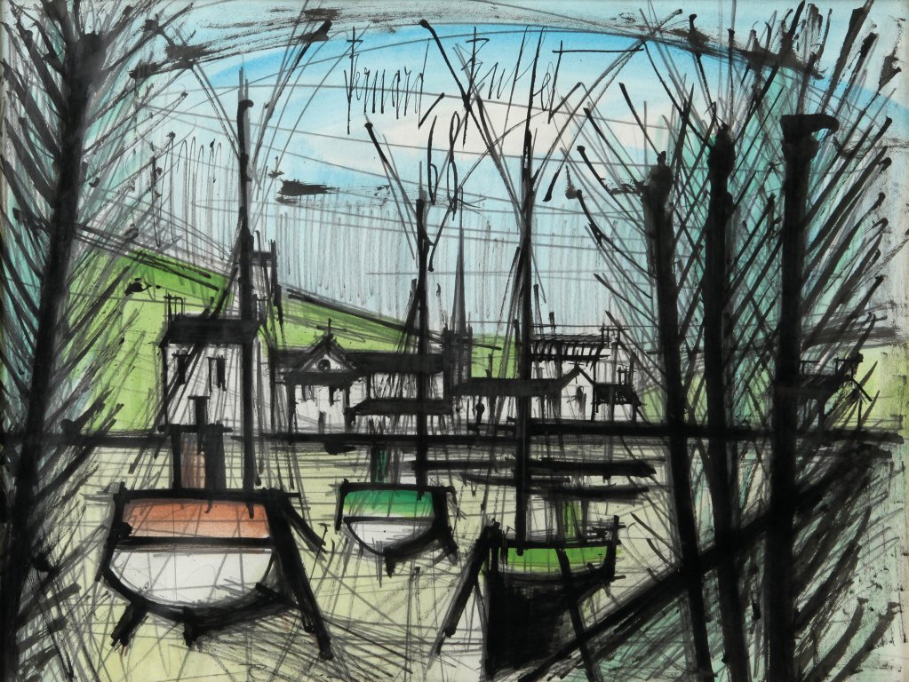 BERNARD BUFFET (1928 -1999) Paesaggio bretone 1967 tecnica mista su carta cm 50x65 firmato e datato in alto al centro autentica dell'artista su foto etichetta galleria San Giorgio, Portofino sul retro catalogato con il n°24743 Paesaggio bretone 1967 mixed media on paper 19,7x25,61 in signed and dated upper in the centre photo certificate from the artist label of San Giorgio gallery, Portofino on the reverse cataloged with n°24743ice Garnier gallery, Paris