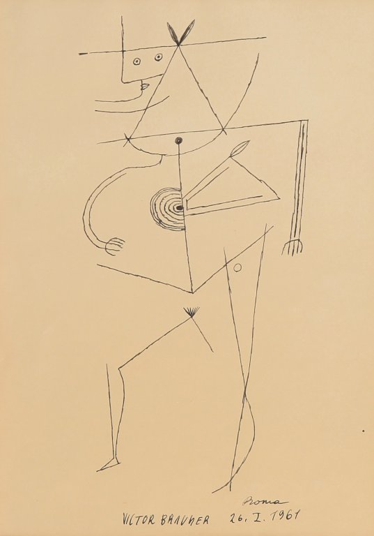 VICTOR BRAUNER (1903 - 1966) Senza titolo 26-1-1961 penna su carta cm 27,5x19,5 firmato e datato in basso al centro provenienza: già Collezione Brera Galleria d'Arte, Milano Untitled 26-1-1961 pen on paper 10,84x7,68 in signed and dated lower in the center provenance: already Brera Art Gallery Collection, Milano