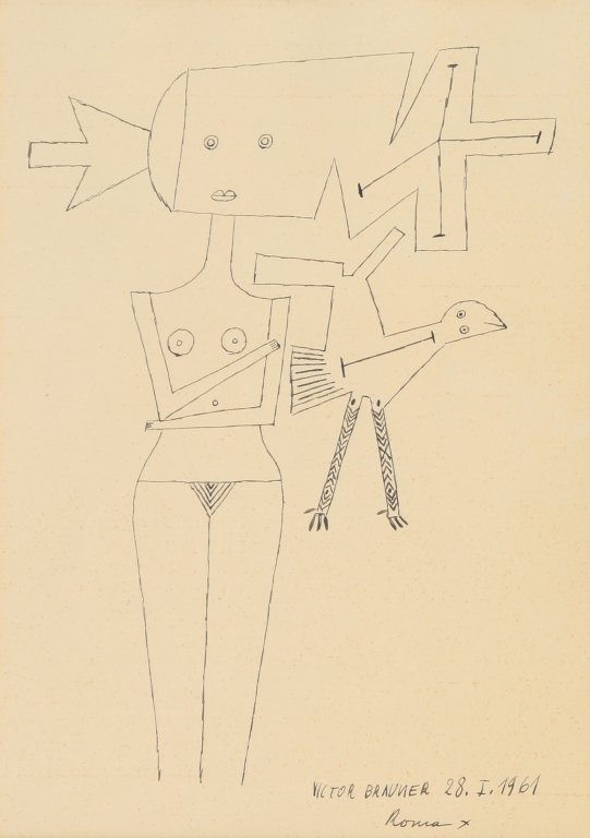 VICTOR BRAUNER (1903 - 1966) Senza titolo 28-1-1961 penna su carta cm 27,3x19,3 firmato e datato in basso a destra provenienza: già Collezione Brera Galleria d'Arte, Milano Untitled 28-1-1961 pen on paper 10,76x7,6 in signed and dated lower right provenance: already Brera Art Gallery Collection, Milano