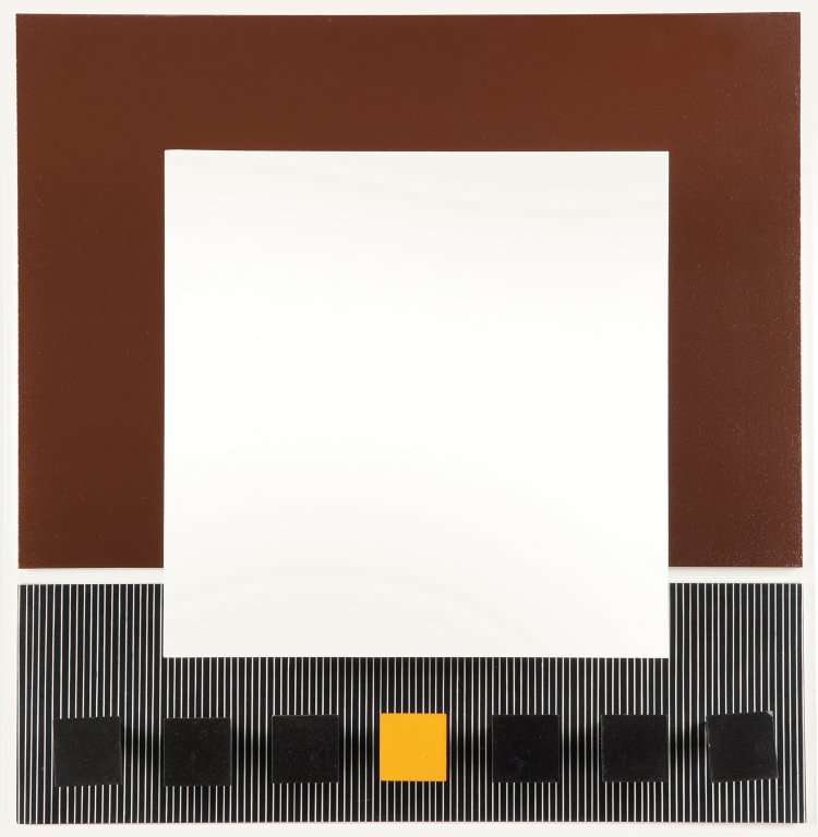 JESUS RAPHAEL SOTO (1923 - 2005) Le point jaune 1989 acrilico su tavola con griglia metallica cm 53x52x17 firmato, datato e titolato sul retro autentica su foto dell'Archivio Soto (Parigi) n°94897066 Le point jaune 1989 acrylic on board with metal grid 20,88x20,49x6,7 in signed, dated and titled on the reverse photo certificate by Soto Archive (Paris) n°94897066
