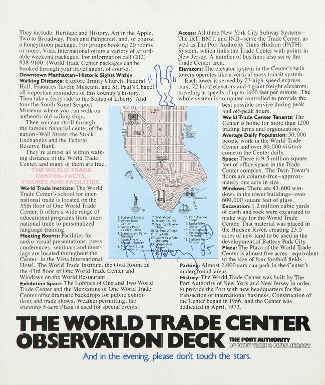 KEITH HARING (1958 - 1990) Pianta di New York 1985 inchiostro su mappa di New York con indicazioni del WTC cm 23x19,5 firmato e datato in basso al centro donato dall'artista all'attuale proprietario a New York Pianta di New York 1985 ink on New York map with WTC informations 9,06x7,68 in signed and dated lower in the centre donated by the artist to the current owner in New York