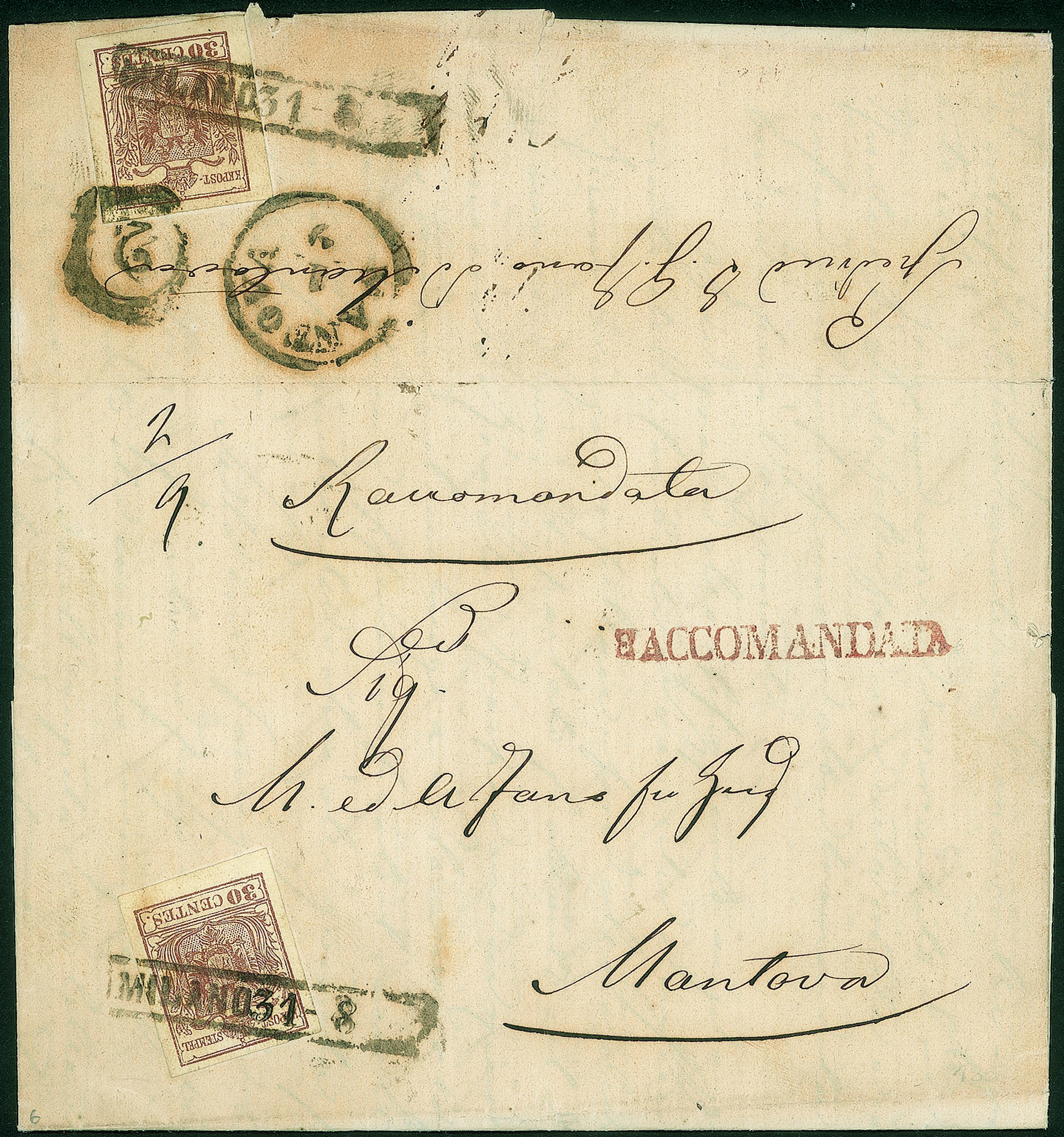 Antichi Stati Italiani - Lombardo Veneto - Milano (R53 - P.ti 12)Lettera raccomandata del 31.8.1857 per Mantova affrancata con due 30 cent secondo tipo (9) sia sul recto che sul verso