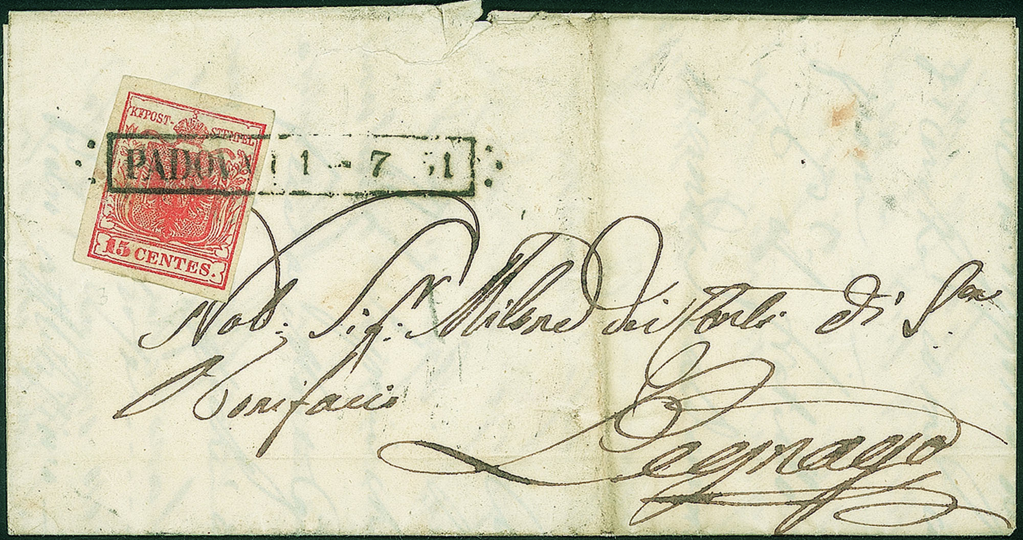 Antichi Stati Italiani - Lombardo Veneto - Padova (R51 - P.ti 7)Lettera del 1.7 per Legnago affrancata con 15 cent I tipo carta a mano (3)
