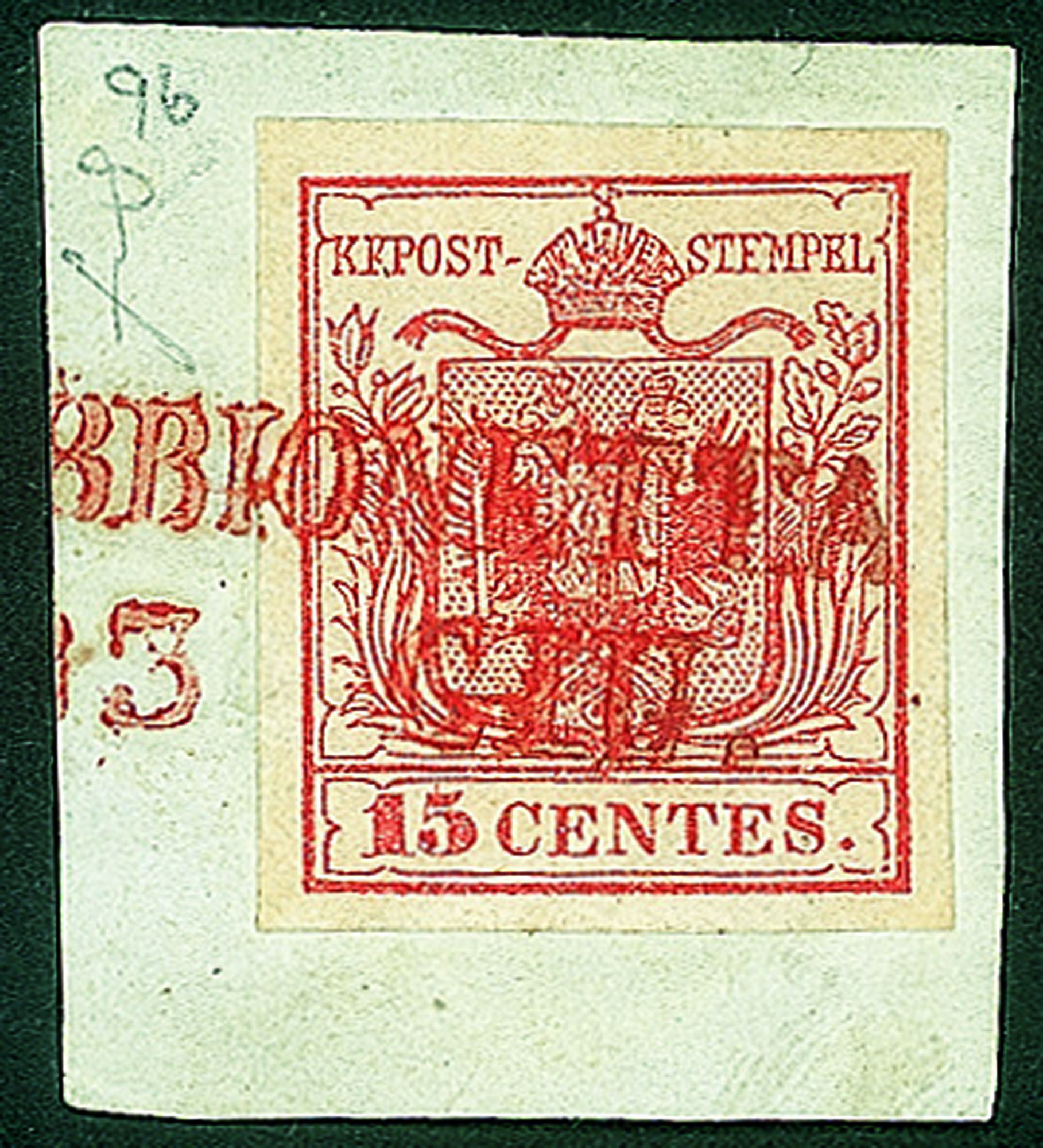 Antichi Stati Italiani - Lombardo Veneto - Sabbionetta (stampatello dritto - P.ti R4)Frammento del 13.6.1850 tredicesimo giorno d'uso con 15 cent primo tipo prima tiratura carta a mano (3a) - firma Fiecchi + cert. E. Diena