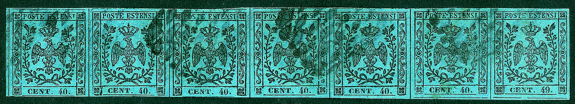 Antichi Stati Italiani - Modena - Striscia orizzontale di sette del 40 centCon l'esemplare finale con errore cifra 49 (10/10a) - buoni margini - rarità - usata - cert. A. Diena + R. Diena + Colla