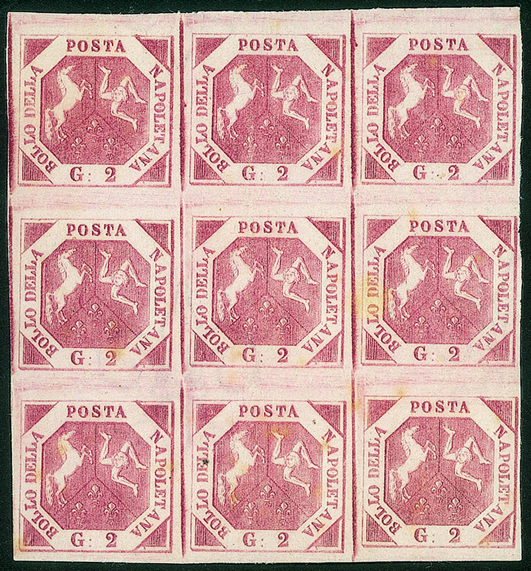 Antichi Stati Italiani - Napoli - 1858 - Blocco di nove esemplari (7e cat. 45.000)Blocco di nove esemplari 2 gr. carminio vivo IIIa Tavola (7e cat. 45.000) - raro - fresco di colore e di gomma - perfetto - cert. ED