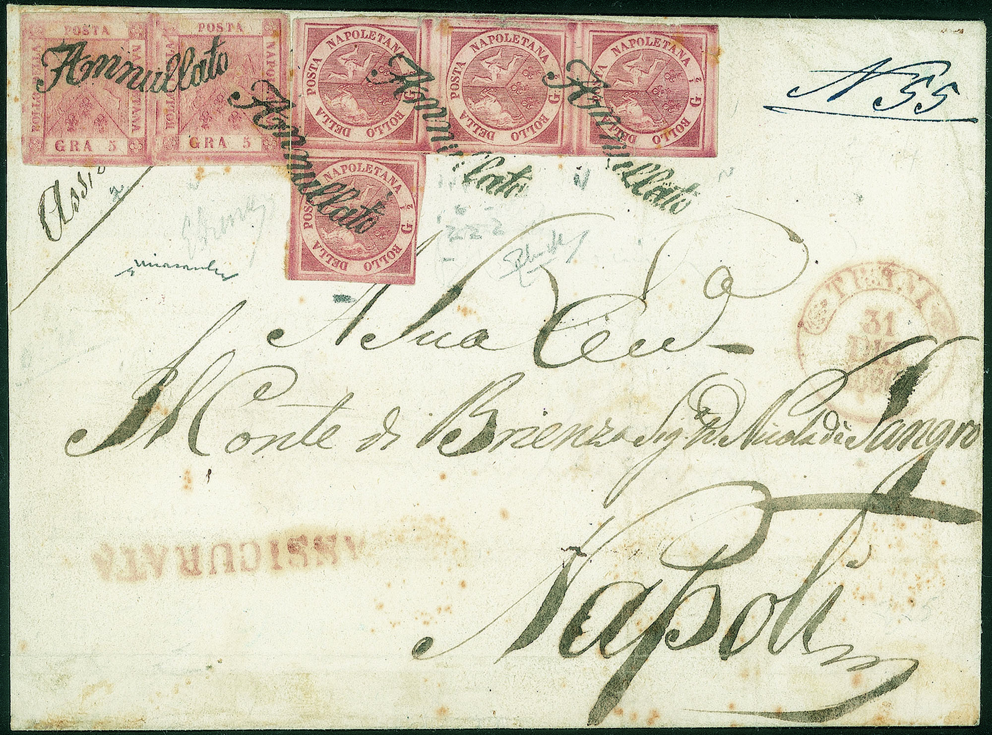 Antichi Stati Italiani - Napoli - Lettera (4+9)Lettera assicurata con striscia verticale di quattro a seggiola del 1/2 grano II tavola + coppia 5 grana II tavola (4+9) annullati con Svolazzo da Trani 31 DIC.1860 per Napoli - firma R.Mondolfo - rara e di ottima qualità