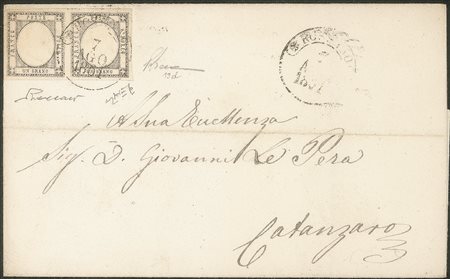 Antichi Stati Italiani - Napoli - Province Napoletane - Lettera (19d)Lettera affrancata con coppia orizzontale del 1 grano grigio argento (19d) perfetta e ben marginata da Rossano 7 AGO.1861 a Catanzaro - gradazione di colore molto rara di splendida qualità - cert. P.Vaccari