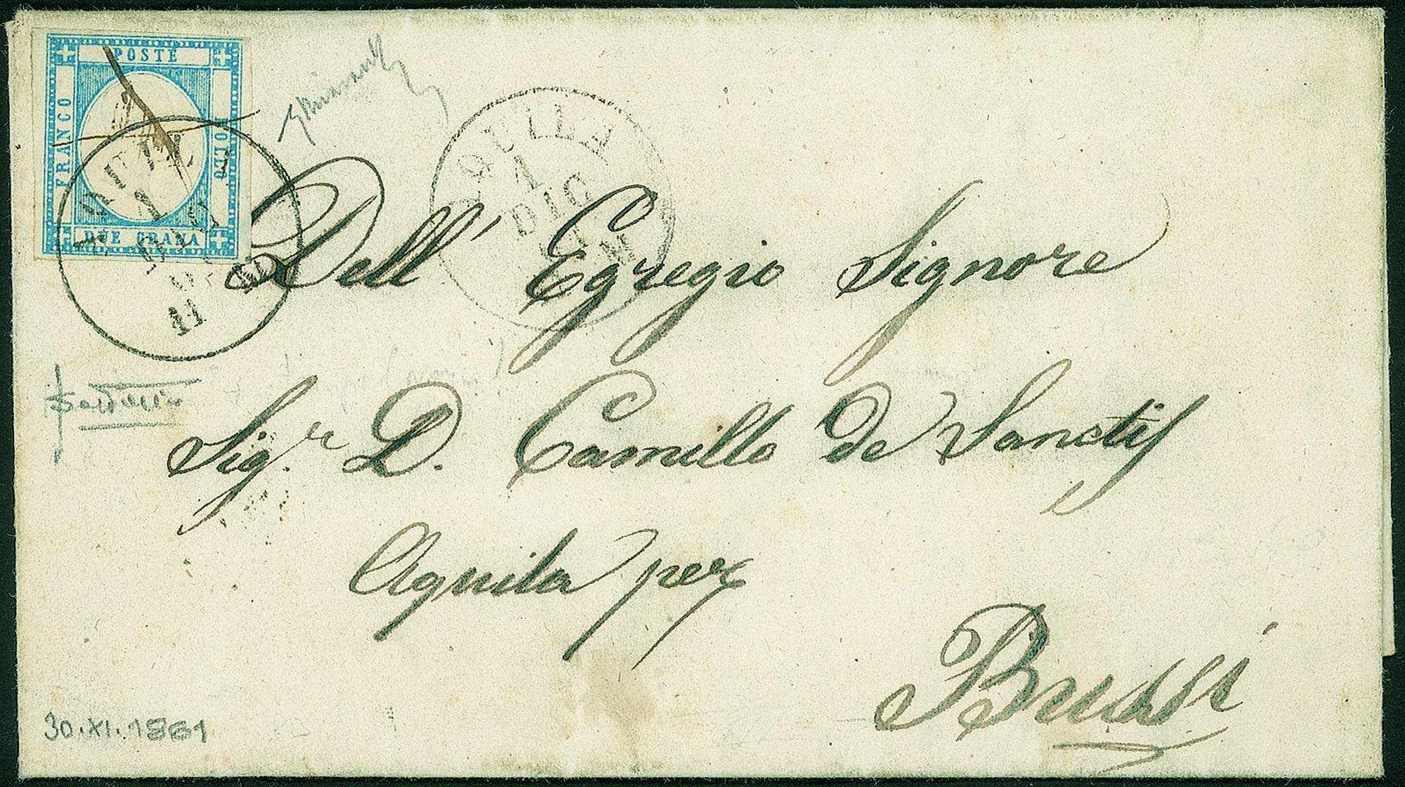 Antichi Stati Italiani - Napoli - Province Napoletane - Lettera (20)Lettera affrancata con 2 grana azzurro chiaro (20) da Amatrice 30 nov.1861 per Bussi annullato con tratti di penna e nuovamente obliterato in transito con bollo sardo italiano Aquila 1 DIC 61 - probabilmente unica - cert. Sottoriva