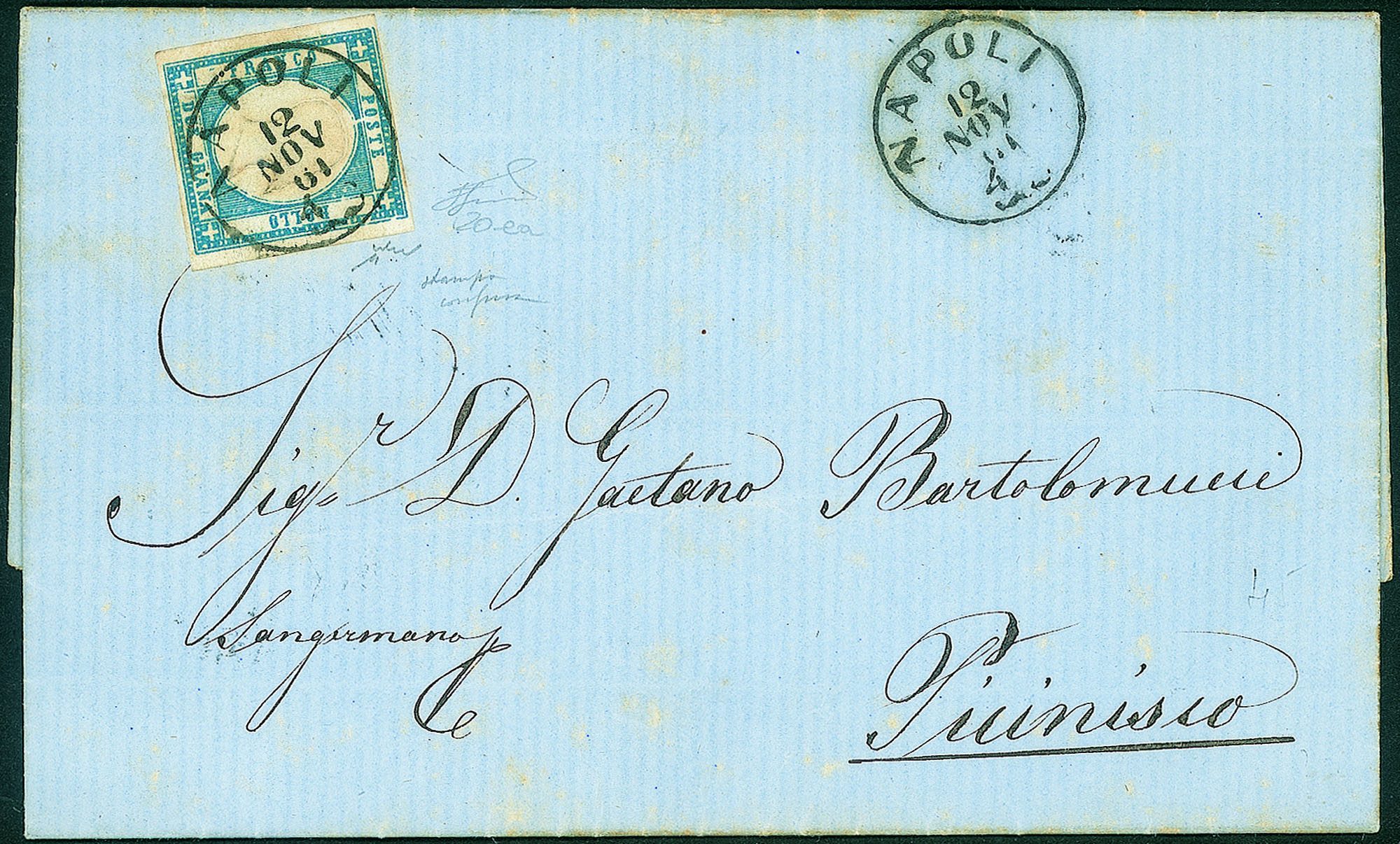 Antichi Stati Italiani - Napoli - Province Napoletane - 1861 - 2 grana (20ea)2 grana azzurro oltremare vivo (20ea) - perfetto - su lettera da Napoli 12 NOV 61 a Picinisio - raro colore - firma Chiavarello