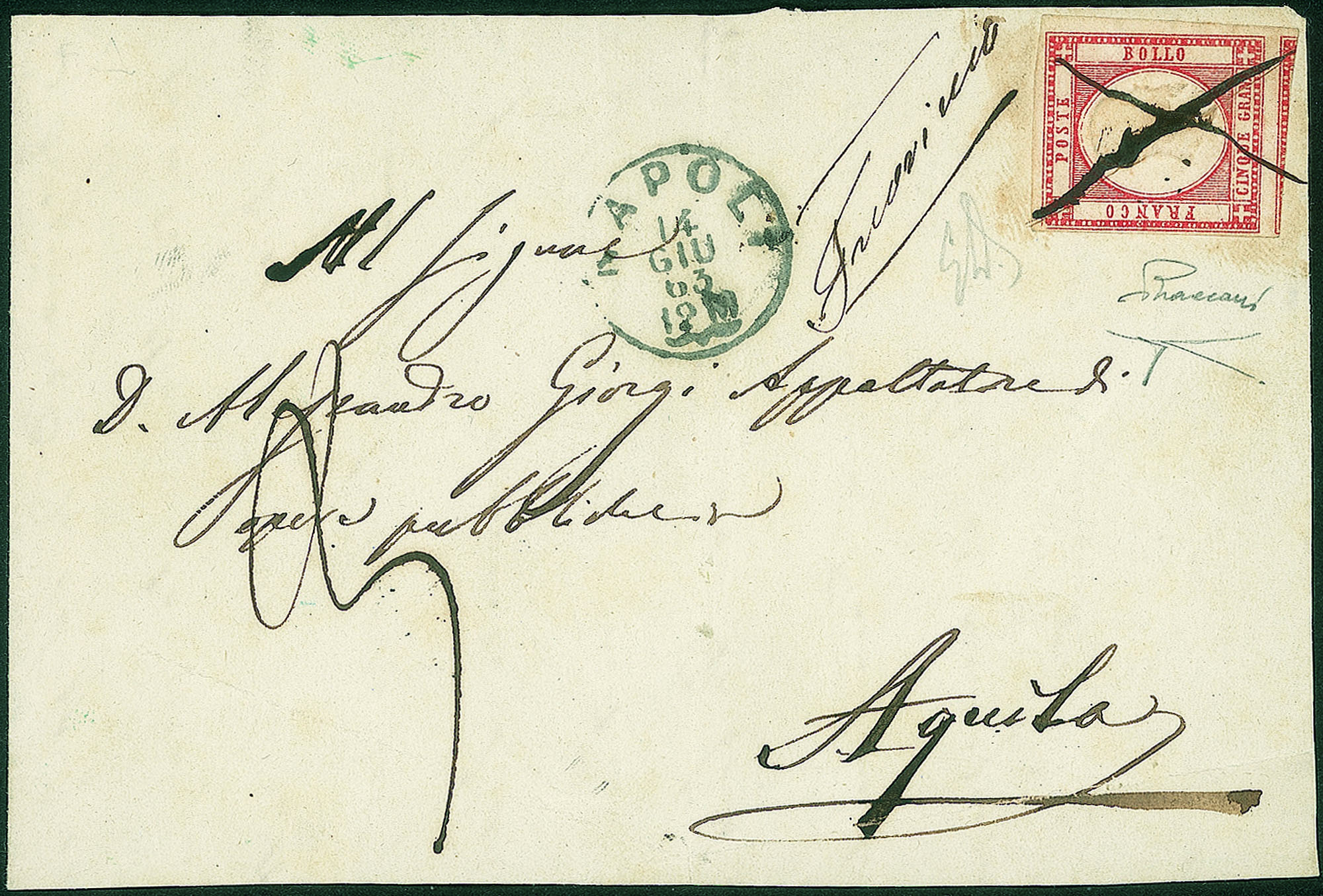 Antichi Stati Italiani - Napoli - Province Napoletane - 1861 - 5 grana rosso carminio (21)Perfetto - su frontespizio completo di lettera da Napoli 14 GIU 63 a L'Aquila - Il francobollo utilizzato ben otto mesi dopo la fine della sua validità postale è annullato con tratti di penna a croce con annotazione manoscritta al lato del francobollo 'Fuori uso' - cert. Bottacchi