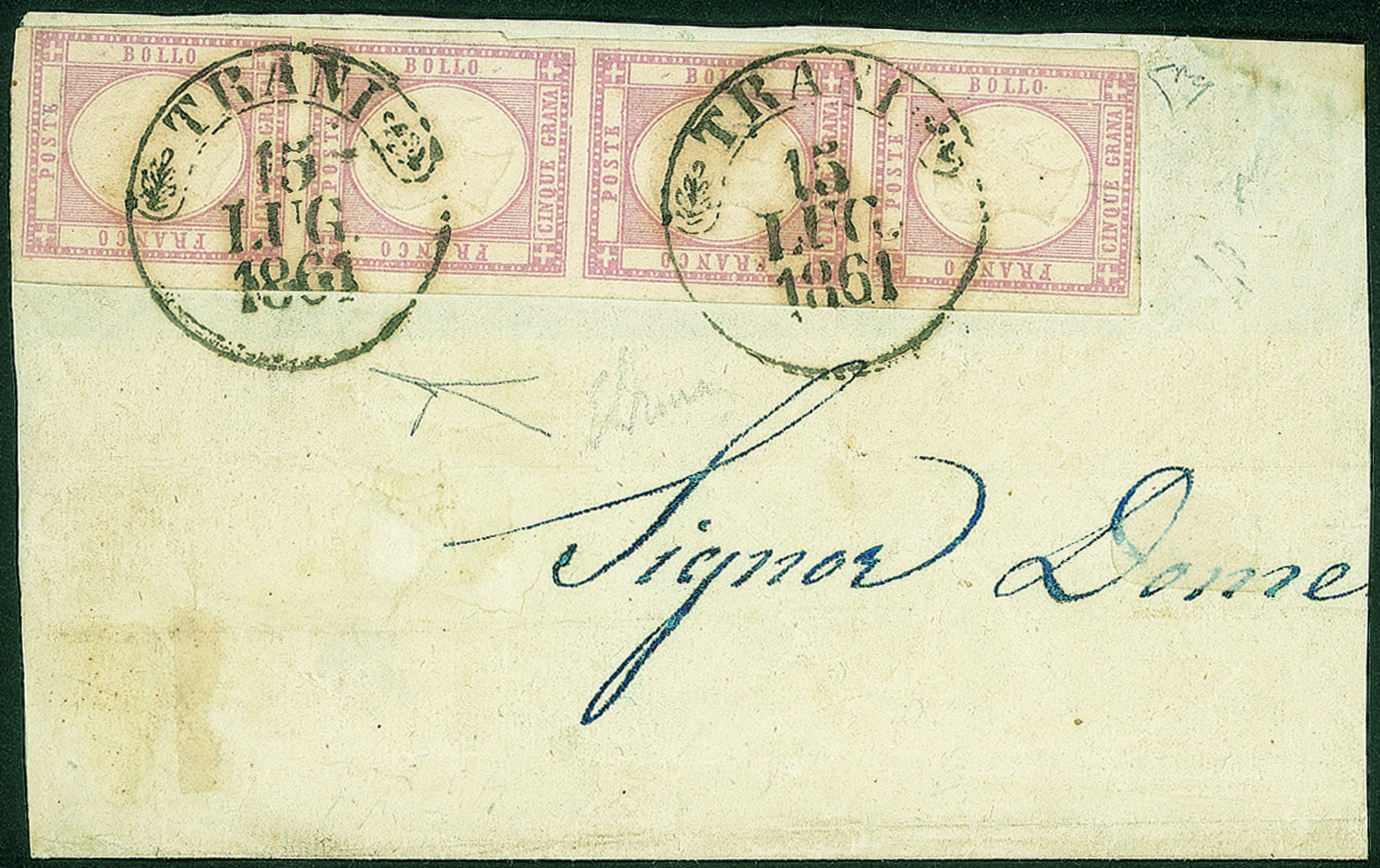 Antichi Stati Italiani - Napoli - Province Napoletane - 1861 - Striscia verticale 5 grana (21c)Striscia verticale di quattro del 5 grana lilla (21c) - in ottimo stato e molto fresca - su ampio frammento di lettera da Trani 15 LUG.1861 - multiplo estremamente raro per questa gradazione di colore - firme Emilio + Enzo Diena + cert. Bottacchi