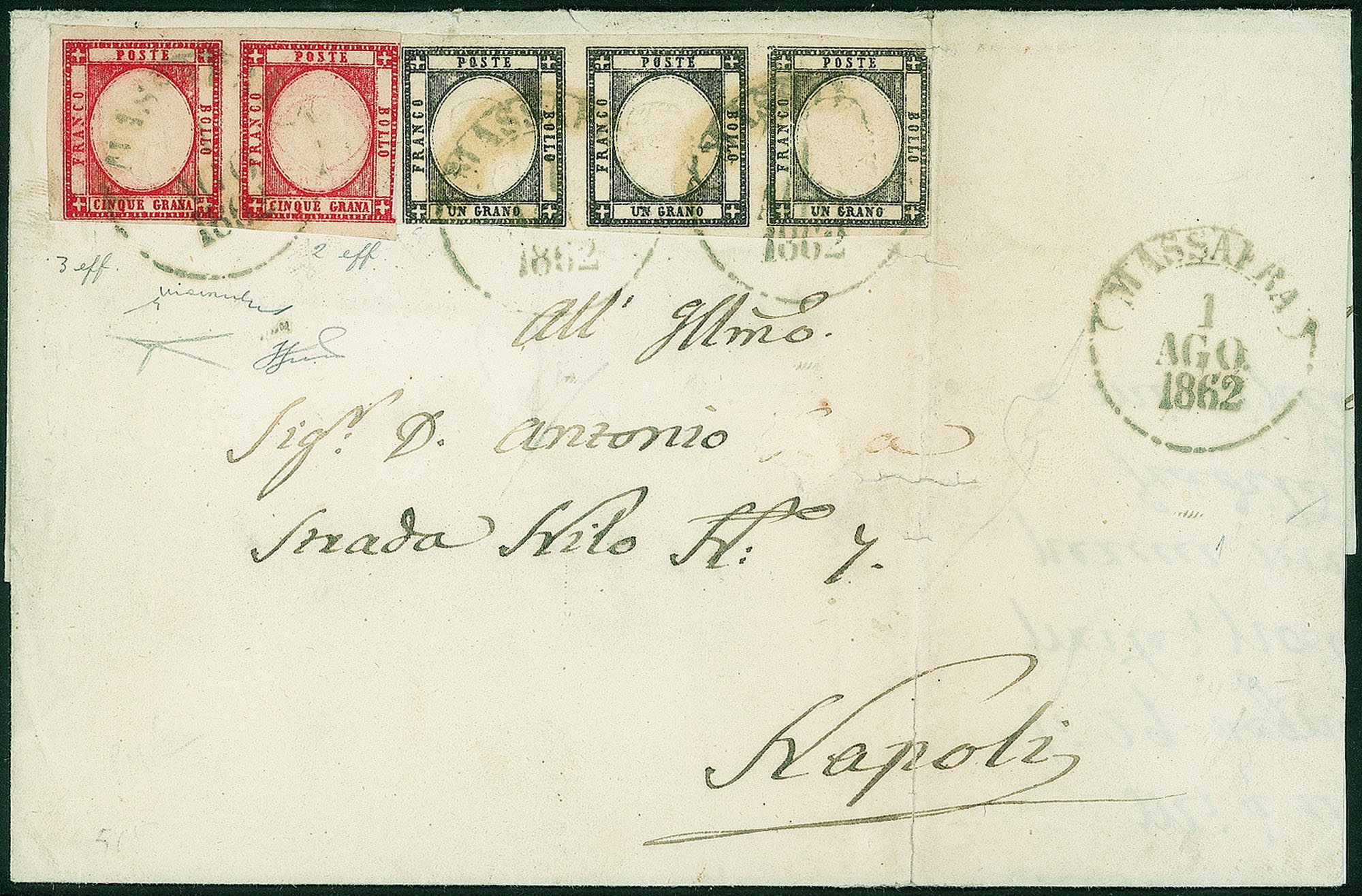 Antichi Stati Italiani - Napoli - Province Napoletane - Lettera (21f var 21ga + 19)Eccezionale lettera affrancata con coppia orizzontale del 5 grana carminio (esemplare di sinistra con tripla effige a rilievo + esemplare di destra con doppia effige a rilievo) + striscia orizzontale di tre del 1 grano nero (21f var 21ga + 19) da Massafra 1 AGO.1862 per Napoli - oggetto di pregio e molto raro - cert. Bottacchi