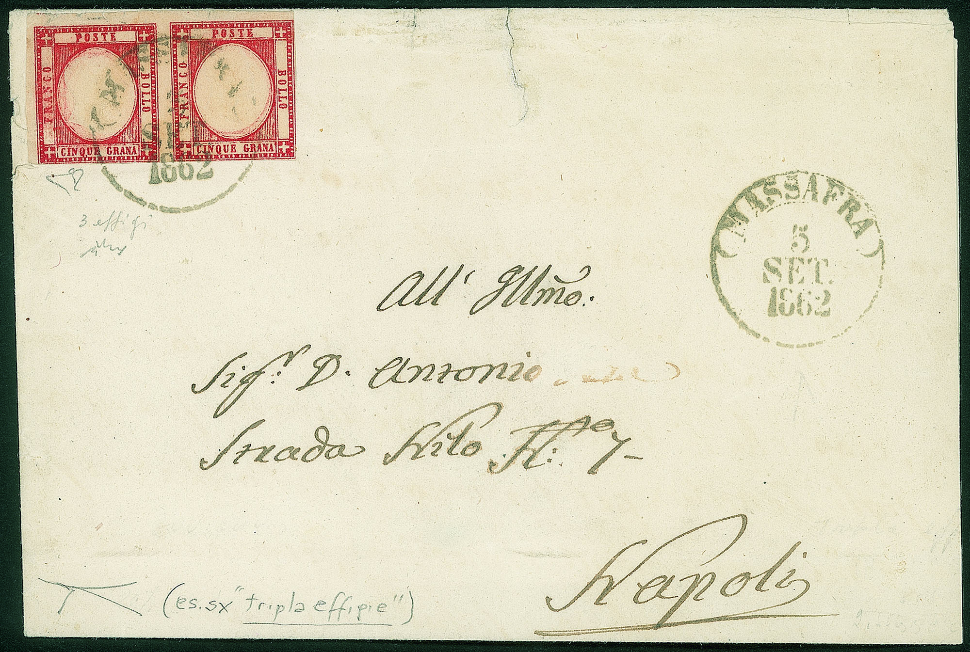 Eccezionale lettera affrancata con coppia orizzontale del 5 grana carminio esemplare di sinistra con tripla effige a rilievo + esemplare di destra con doppia effige (21f var 21ga) da Massafra 5 SETT.1862 per Napoli - oggetto di pregio e molto raro - cert. Bottacchi