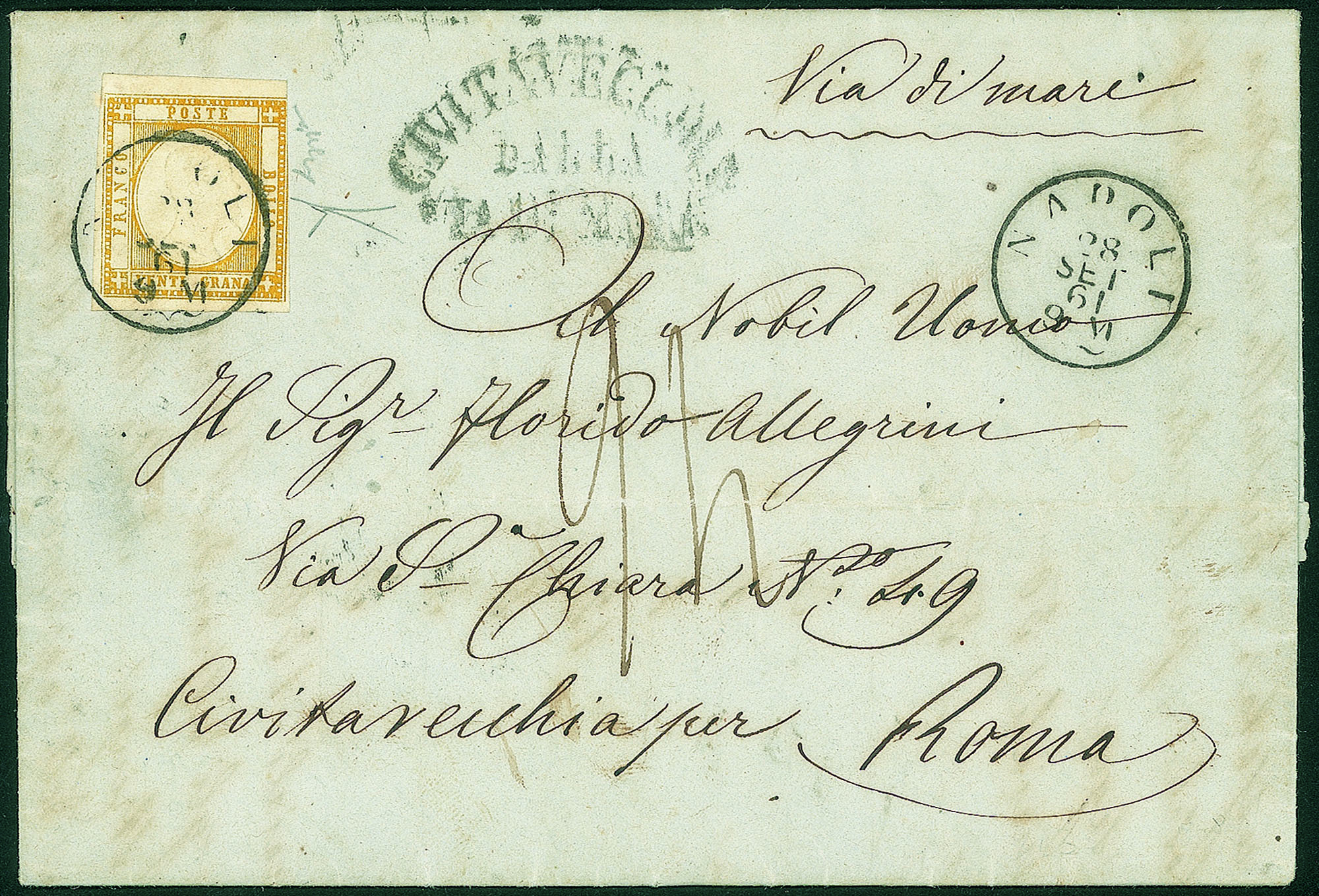 20 grana giallo (23) molto fresco leggermente sfiorato in alto a destra isolato su lettera da Napoli 28 SET 61 a Roma con bollo della via di mare di Civitavecchia - tassata 24 bajocchi - Uso isolato estremamente raro di ottimo aspetto - Firma Chiavarello + cert. Bottacchi