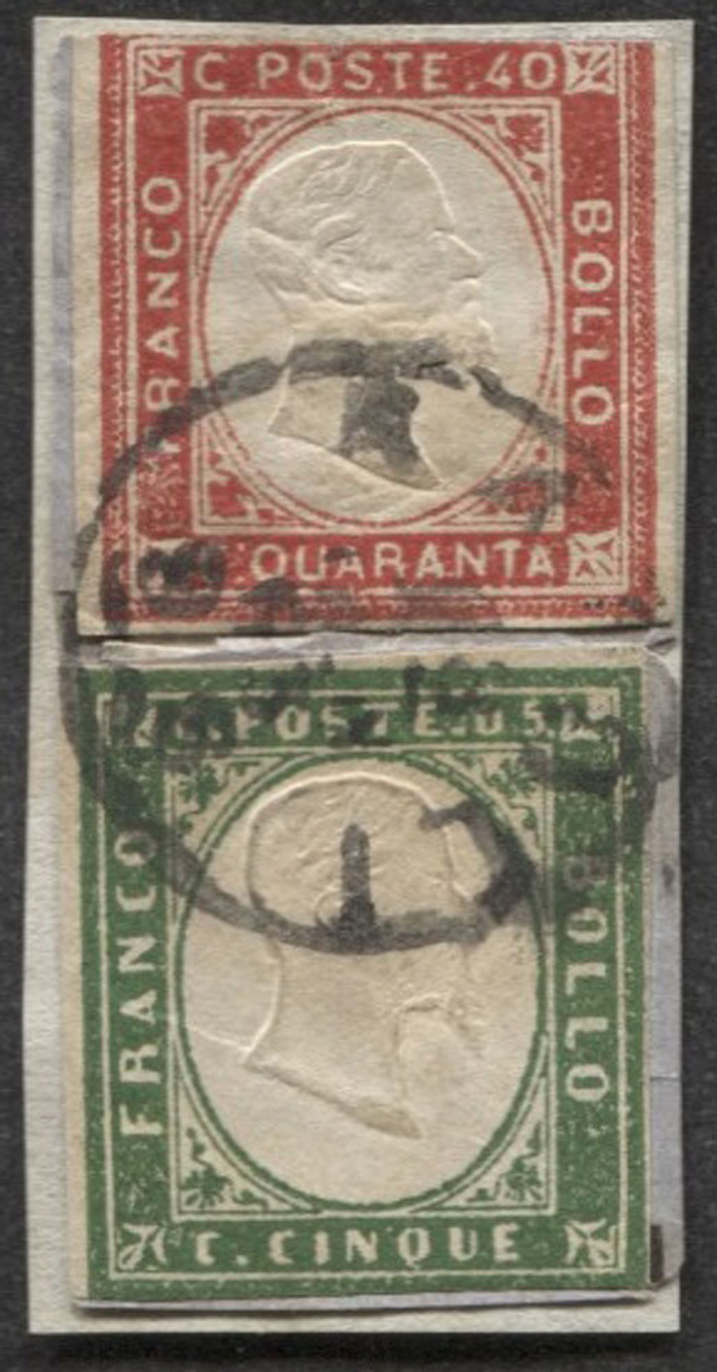 Antichi Stati Italiani - Province Napoletane - 5 + 40 cent (4)Frammento recante un 5 cent Sardegna più 40 cent non emesso - uno dei due conosciuti e l'unico caso di non emesso in affrancatura mista - grande rarità - cert. ED - (4)