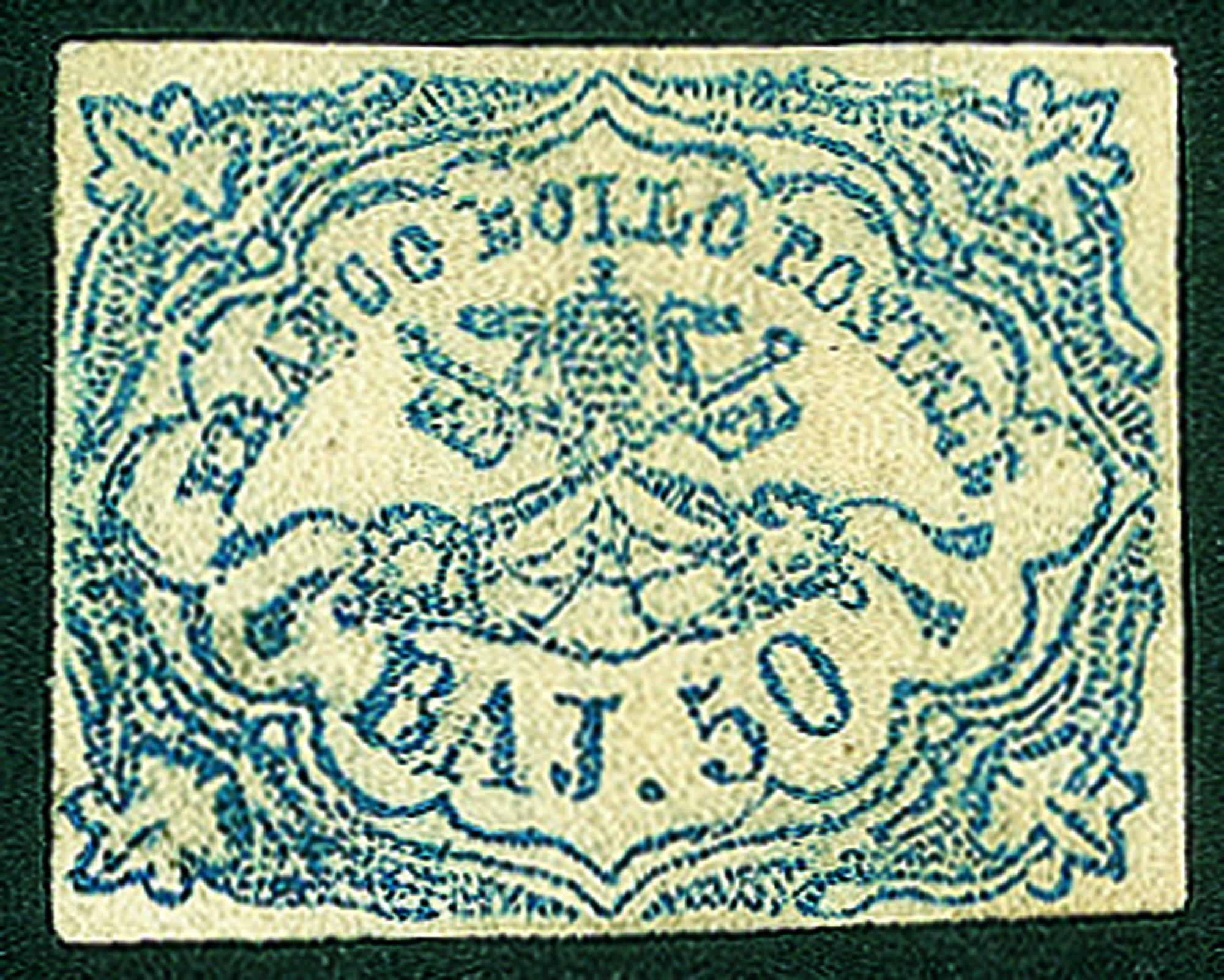Antichi Stati Italiani - Stato pontificio - 1852 - 50 baj (12)Stampa difettosa - ottimo stato di conservazione - gomma originale - cert. Sorani