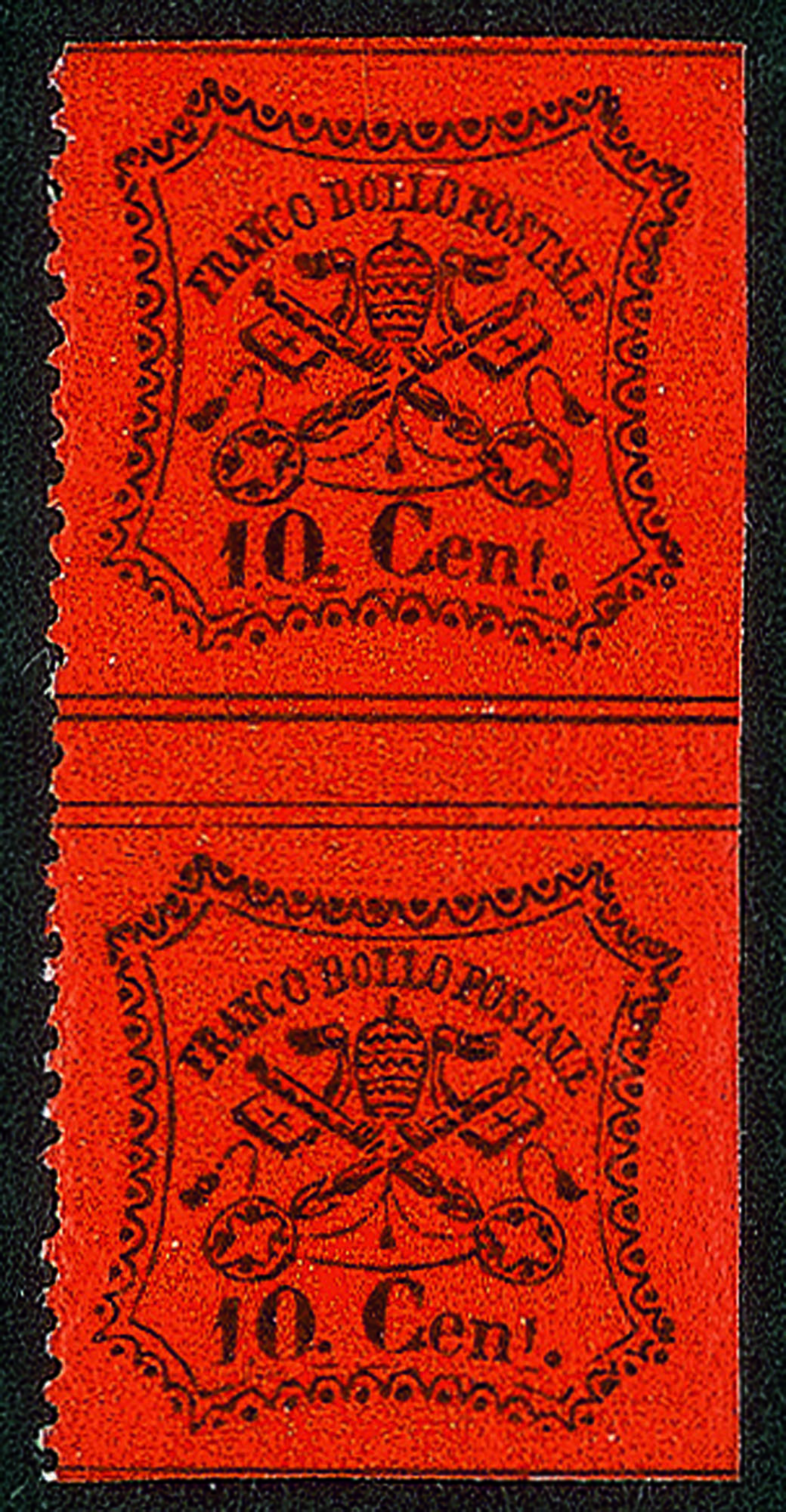 Antichi Stati Italiani - Stato pontificio - 1868 - Coppia verticale del 10 cent (26ga cat.900)Coppia verticale del 10 cent vermiglio (26ga cat.900) con interspazio di gruppo dentellata solo a sinistra - gomma integra - SPL