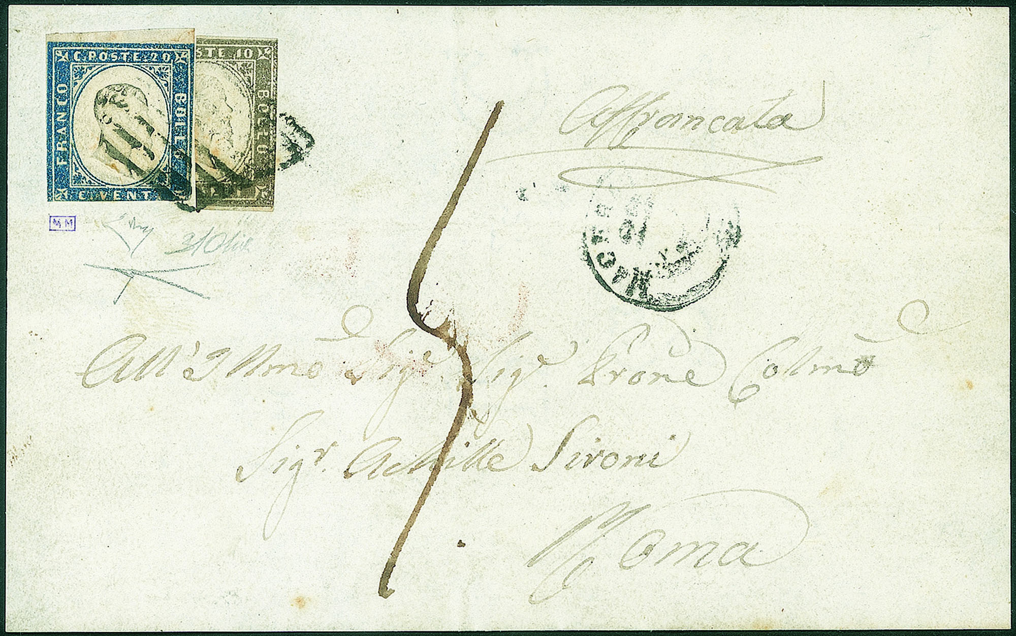 Antichi Stati Italiani - Risorgimento - Periodo commissariale delle Marche - Frontespizio di lettera (14Be + 15Ca)Frontespizio di lettera affrancato con Sardegna 20 cent azzurro + 10 cent bruno grigio frazionato verticalmente a metà ed utilizzato per 5 centesimi (14Be + 15Ca) annullati col muto a losanga pontificia di Macerata 22 NOV 60 diretto a Roma - tassato per 5 bajocchi per l'inoltro all'interno dello stato Pontificio - insieme di grande rarità storico postale - cert. Bottacchi
