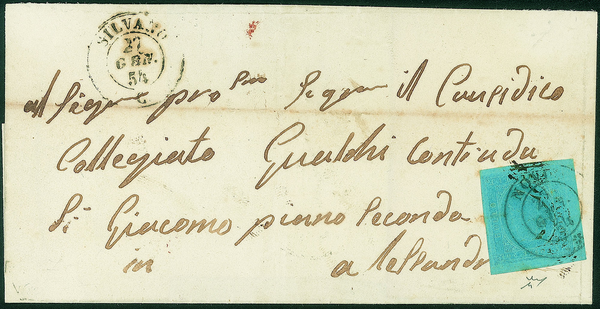 Antichi Stati Italiani - Sardegna - Lettera (5)Lettera da Silvano/c 27 GEN.54 per Alessandria affrancata con 20 cent azzurro seconda emissione (5) annullato in transito a Novi - non ci risultano note altre lettere da Silvano affrancate con questa emissione - firma Chiavarello