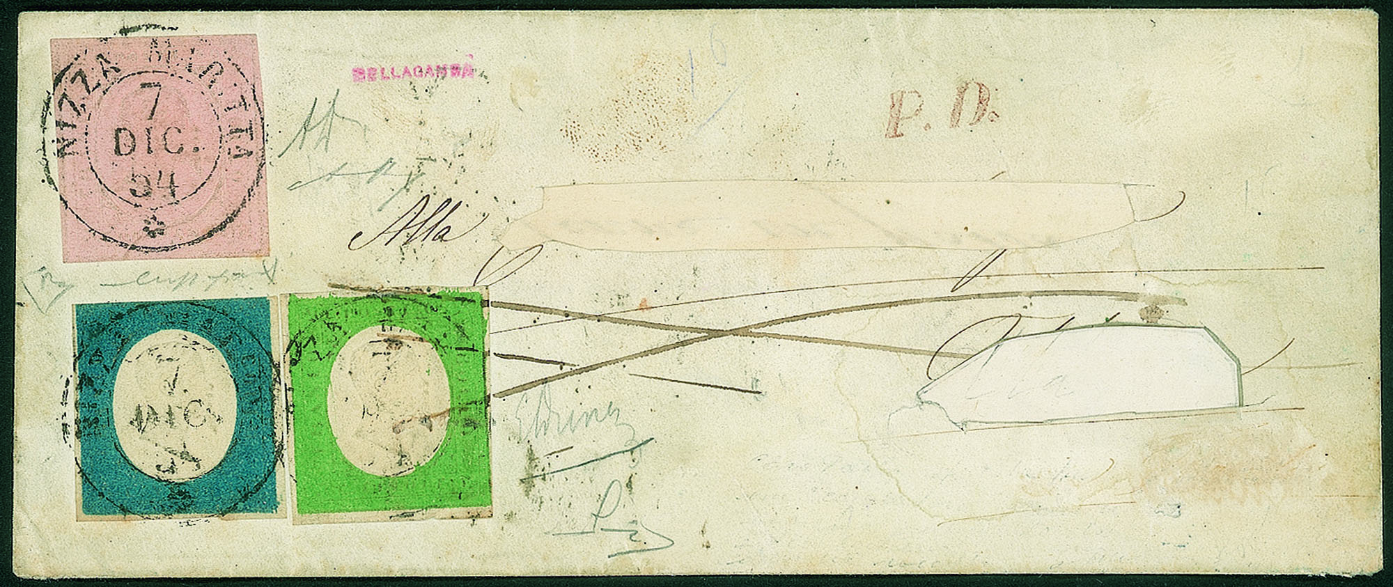 Antichi Stati Italiani - Sardegna - Lettera (6 + 7 + 8)Lettera tricolore in affrancatura mista con 40 cent rosa II emissione + 5 cent verde III emissione + 20 cent azzurro (6 + 7 + 8) da Nizza Maritt.a 7 DIC. 54 a Udine in tariffa dalla seconda distanza Sarda alla terza distanza Austriaca - di questa combinazione è noto un frammento e un'altra lettera oltre a questa - indirizzo ritagliato e minimi difetti ma insieme di grande rarità - cert. Enzo Diena + Manzoni + Bolaffi